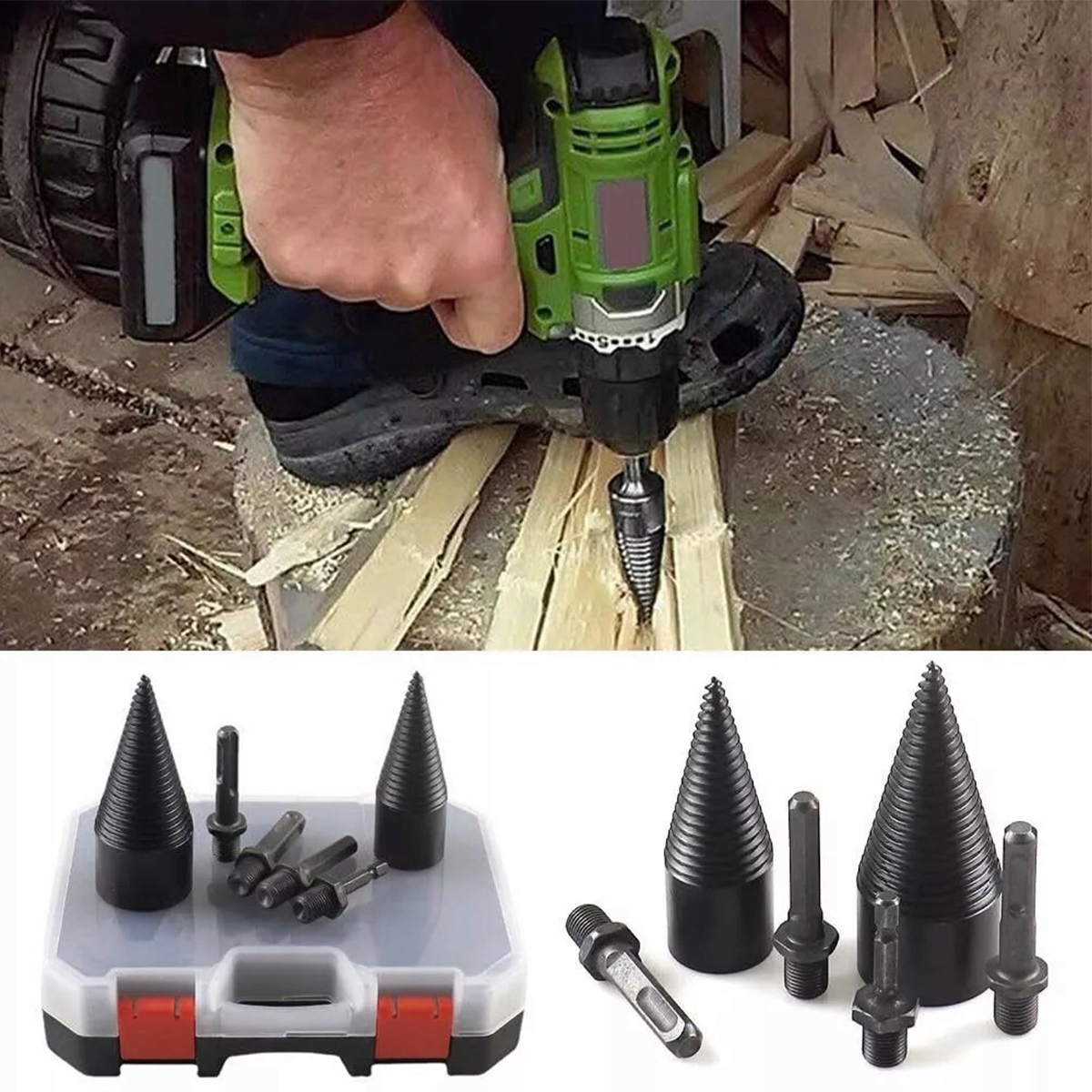 Свердло для розколювання деревини діаметром 32 мм + свердло для розколювання деревини діаметром 45 мм + 4 ручки (квадратна + кругла + шестигранна + маленька шестигранна) задовольнять усі ваші потреби та можуть використовуватися з різними типами електричних дрилів.