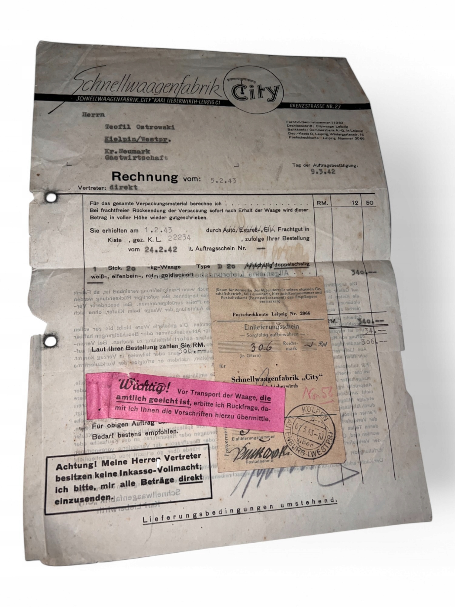 ШНЕЛЛВААГЕНФАБРИК СІТІ РАХУНОК 1943р.