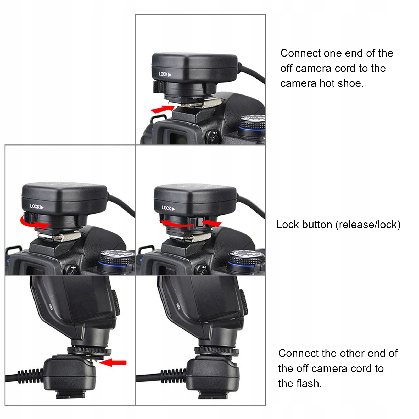Як використовувати:1. Установіть верхній шнур спалаху на гарячий башмак від шнура спалаху камери 2. Установіть шнур спалаху камери на гарячий башмак у верхній частині камери з основою гарячого башмака від шнура спалаху камери.