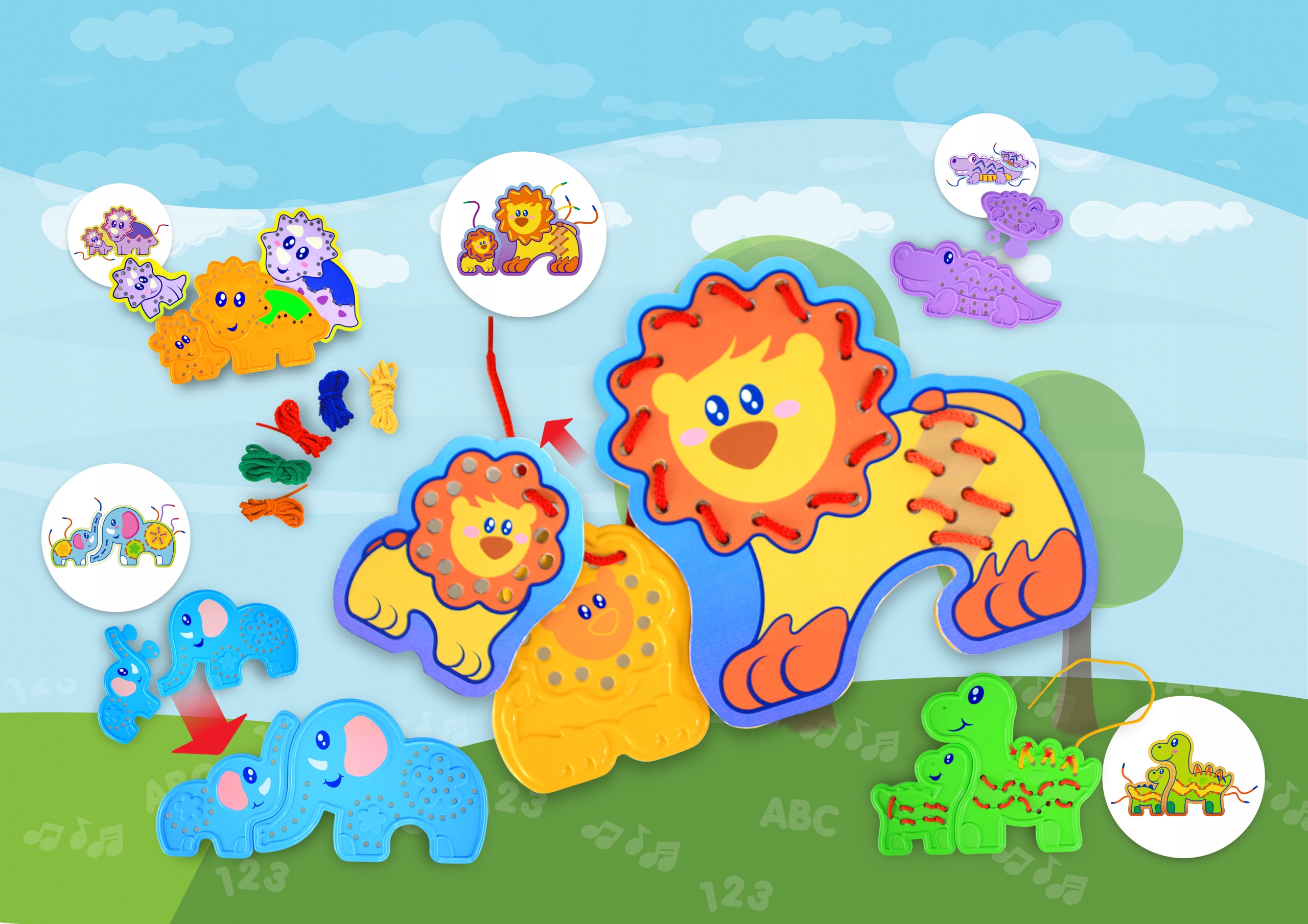 Різнокольорові нитки з тваринами зі спеціально підготовленими отворами подарують дитині масу задоволення та розвинуть її уяву, логічне мислення, творчі здібності та ручні навички.