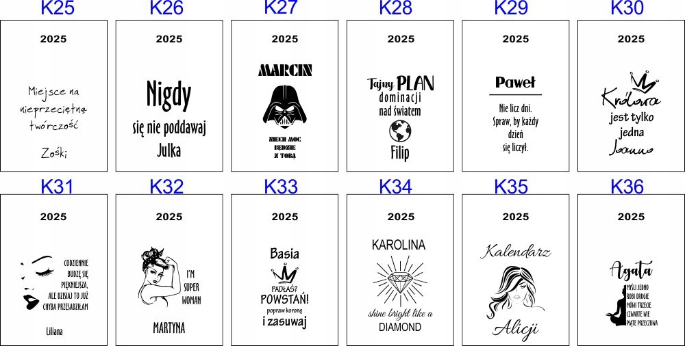 Нижче доступні кольори календаря та кілька десятків наших проектів на вибір . Якщо у вас є інша ідея, надішліть нам повідомлення. У вартість покупки входить виготовлення нових дизайнів за вашими інструкціями