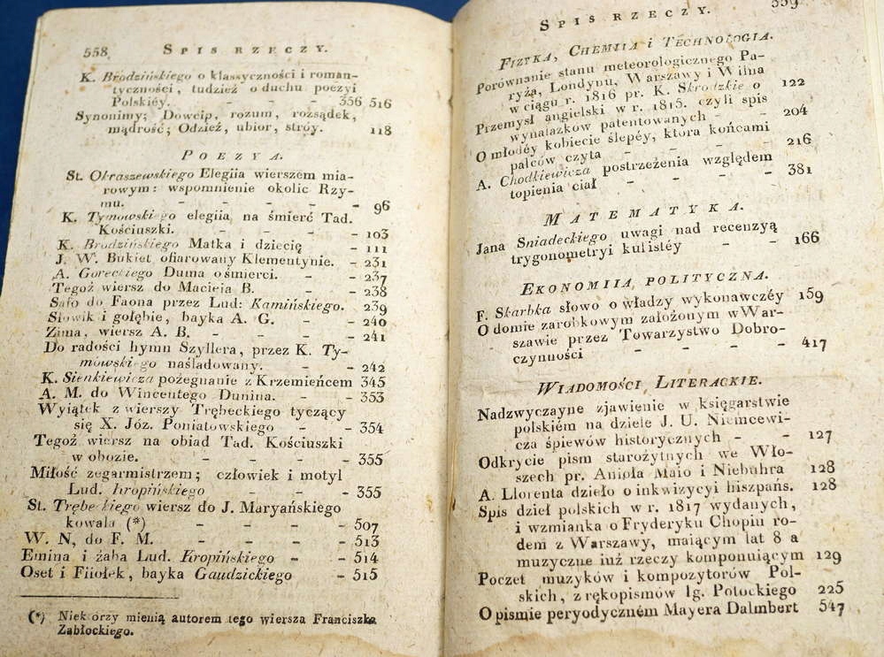 "Варшавський щоденник, тобто щодня науки та навички"-місячні науки. 1815–23 у Варшаві; Під редакцією Ф. Бентковського, 1822–23 К. Бродзінського, Ф. Скарбека та Дж. К. Skrodzki; Зв'язаний з середовищем TPN, у початковий період він продовжував традиції Просвітництва, і з часом на нього вплинули попередня редакція. (Інтерес до нових течій, німецької літератури та роботи Ф. Шиллера, численні переклади його творів); Завдяки високому рівні він відіграв важливу роль у психічному житті царства.
