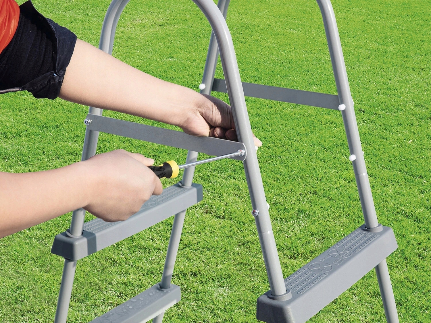Його легко та швидко зібрати, тому вам знадобиться лише кілька хвилин, щоб розкласти його перед прийняттям ванни. Стійка двостороння драбина для басейну - це нова пропозиція від бренду Bestway, яка забезпечить безпеку вашої родини на найвищому рівні! Завдяки цьому ви можете бути впевнені, що ваші малюки в безпеці під час гри.