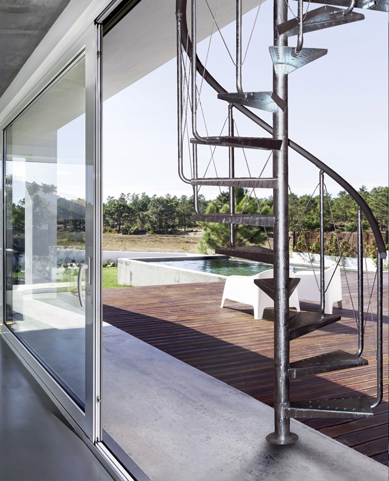 металеві сходи Pinio - це невеликі зовнішні сходи з кучерявим проходом з промисловим виглядом. Комплект включає 11 металевих кроків, платформу, балюстраду. Сходи можна встановити правою або лівою. Їх можна успішно використовувати як зовнішні сходи цілий рік. Металеві кроки, виготовлені з герметичного металу, стійкі до будь -яких погодних умов і безпечних у використанні. Структура була захищена антикорозією через процес оцинкування пожежі. Завдяки цьому процесу зовнішні сходи захищені не лише від іржі. Вони набирають високу міцність до механічного пошкодження (удари, тертя тощо). У той же час необхідне обслуговування поверхні. Діаметр сходів - 120 см, що дозволяє використовувати металеві кроки шириною 50 см.