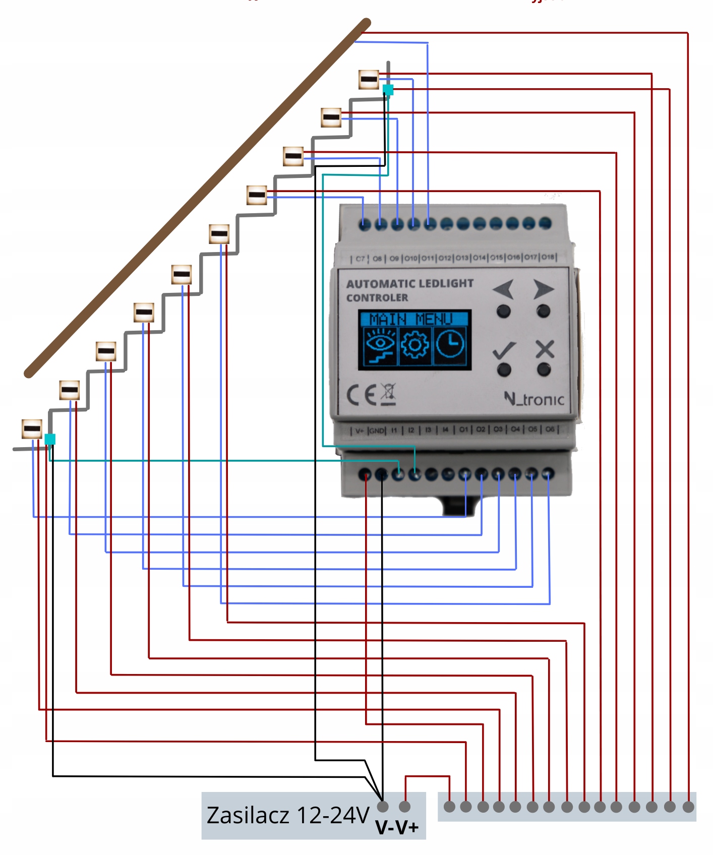 Вишенькою на торті є АСТРОНОМІЧНИЙ ГОДИННИК. Контролер може керувати освітленням від заходу до сходу сонця без використання датчика сутінків. Це означає, що робочий час змінюється щодня. Більше того, ми можемо перемістити ці робочі точки, якщо ми хочемо, щоб сходи працювали, наприклад, за 20 хвилин до сходу сонця.