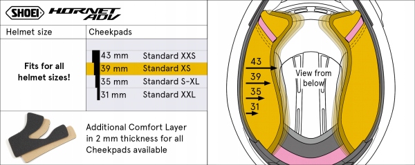 За допомогою наших накладок на щоки ви можете замінити оригінальну підкладку шолома. Або використовуйте трохи товщу або тоншу подушечку для індивідуального регулювання. Щочні накладки HORNET ADV є взаємозамінними в усіх доступних розмірах, як показано в таблиці нижче.