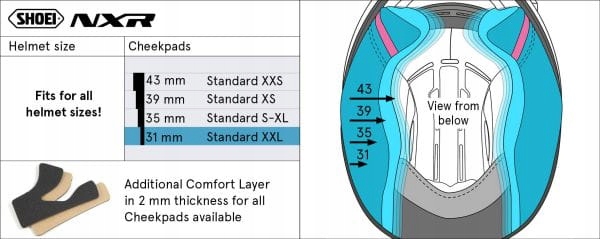 За допомогою наших накладок для щік ви можете замінити оригінальну підкладку свого шолома. Або використовуйте трохи товстішу або тоншу підкладку для індивідуального регулювання. Щочні подушечки NXR взаємозамінні в усіх доступних розмірах, як показано в таблиці нижче.