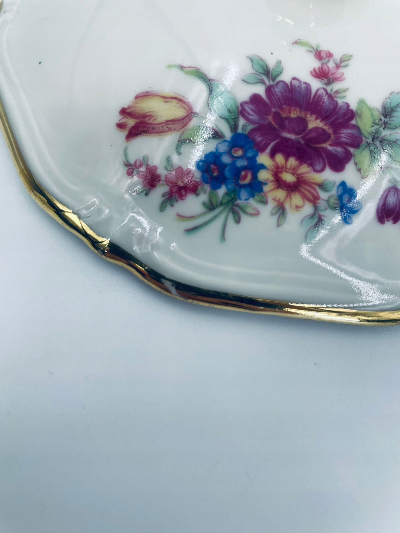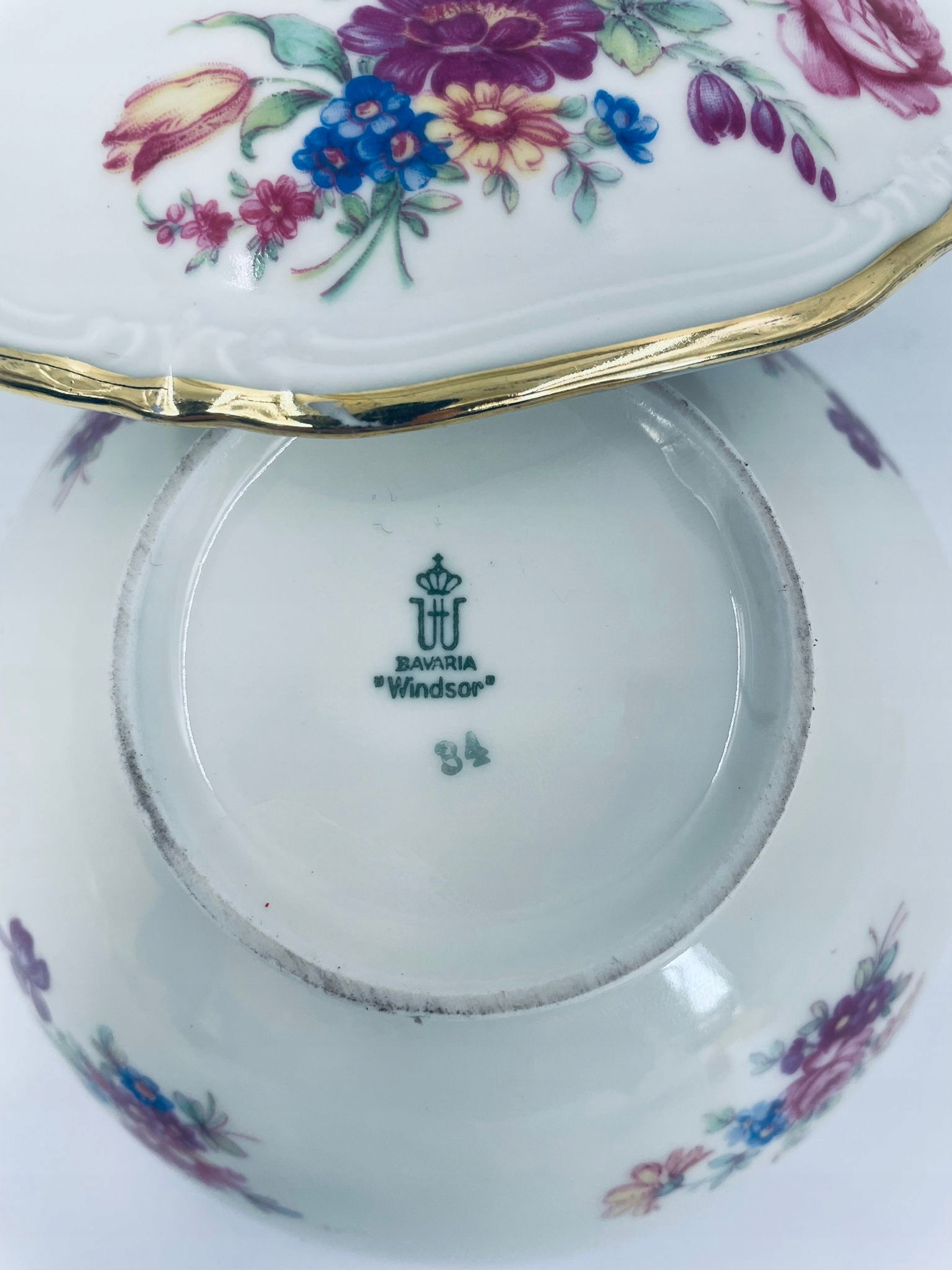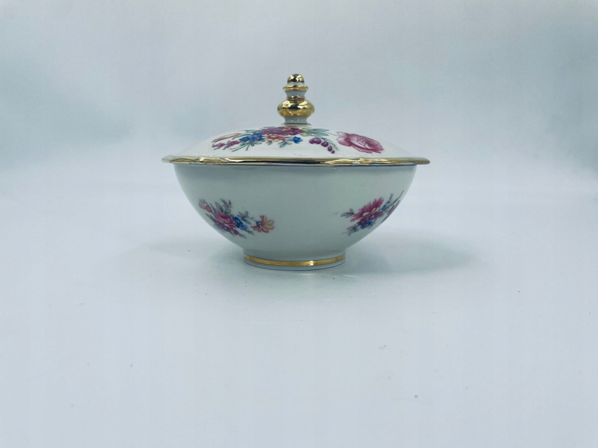 Коробка шоколадок Winterling Windsor, виготовлена з високоякісної порцеляни, прикрашена різнокольоровими квітами на кришці та корпусі посудини, оброблена позолотою. Посудина округлої форми з декоративним, трохи хвилястим краєм кришки та декоративною золотою ручкою. Має невеликі потертості на позолоті.
