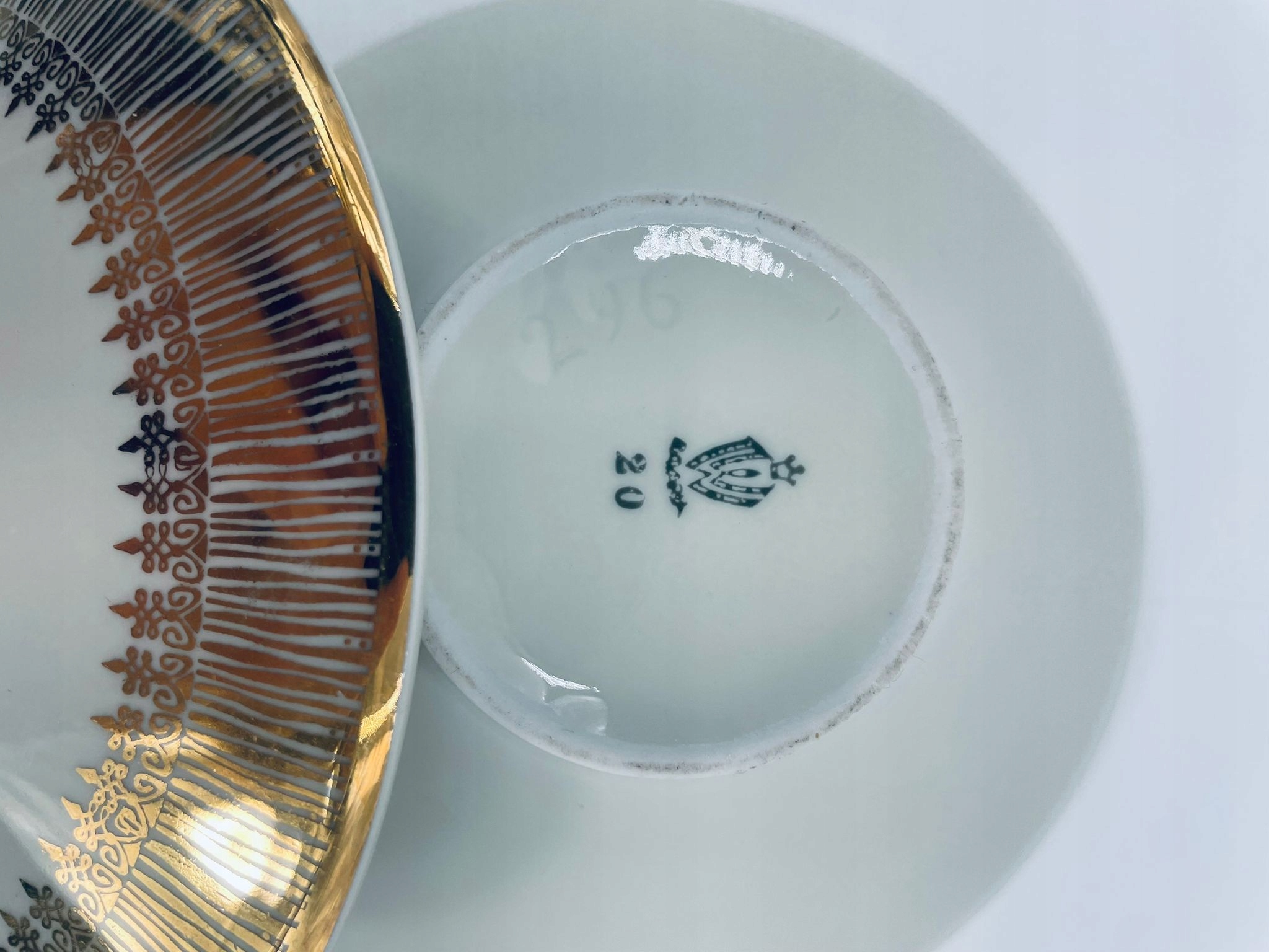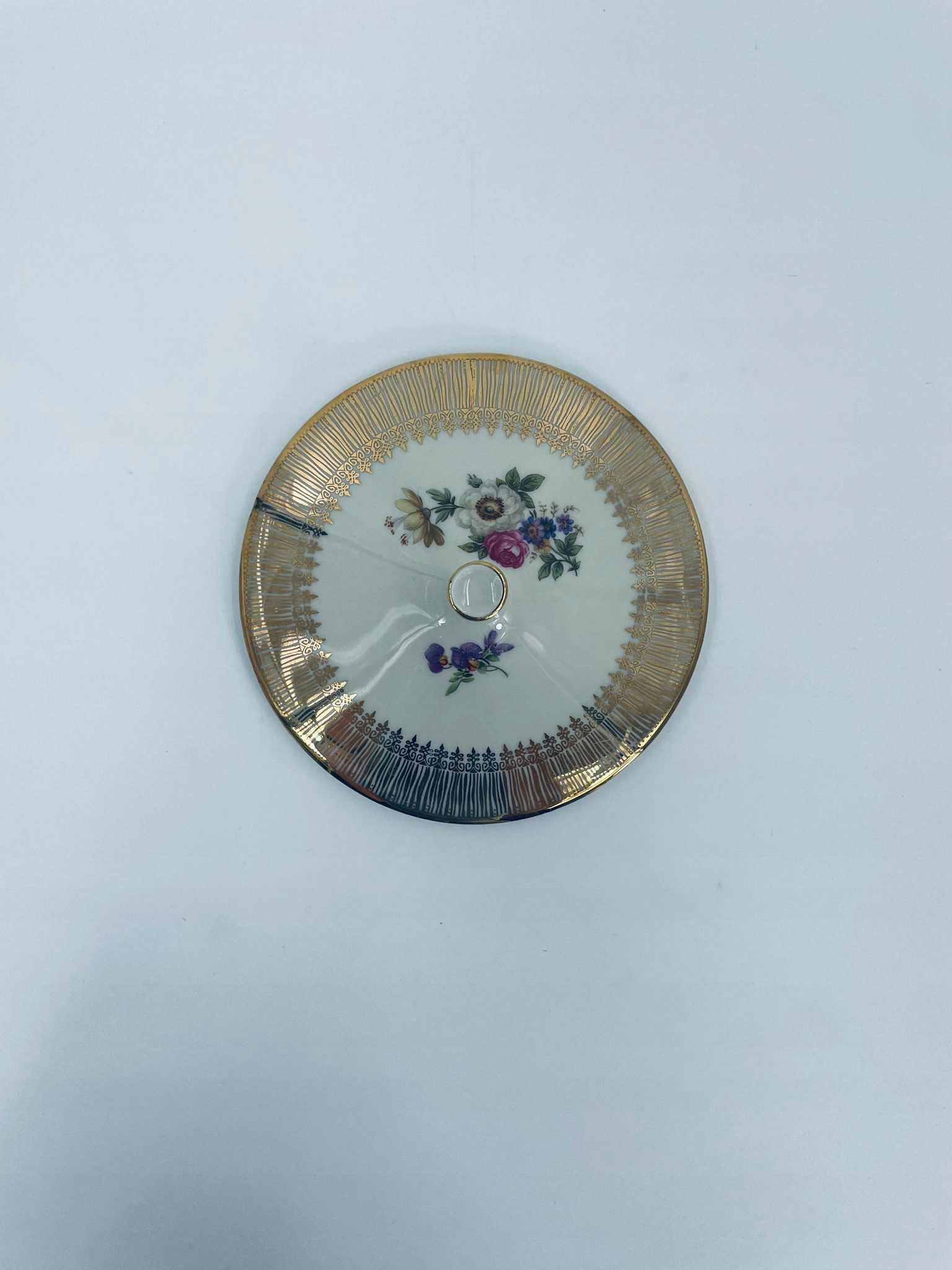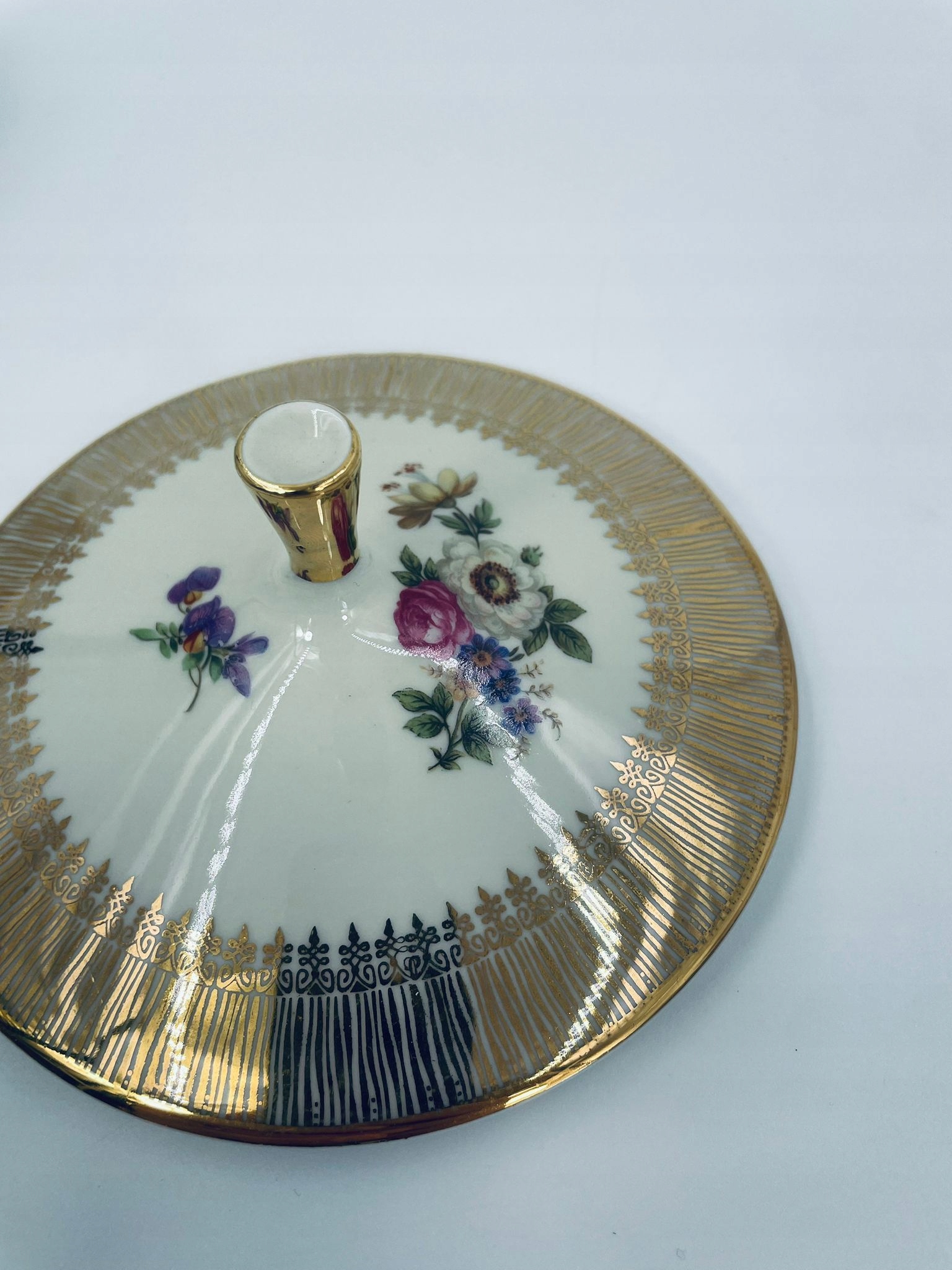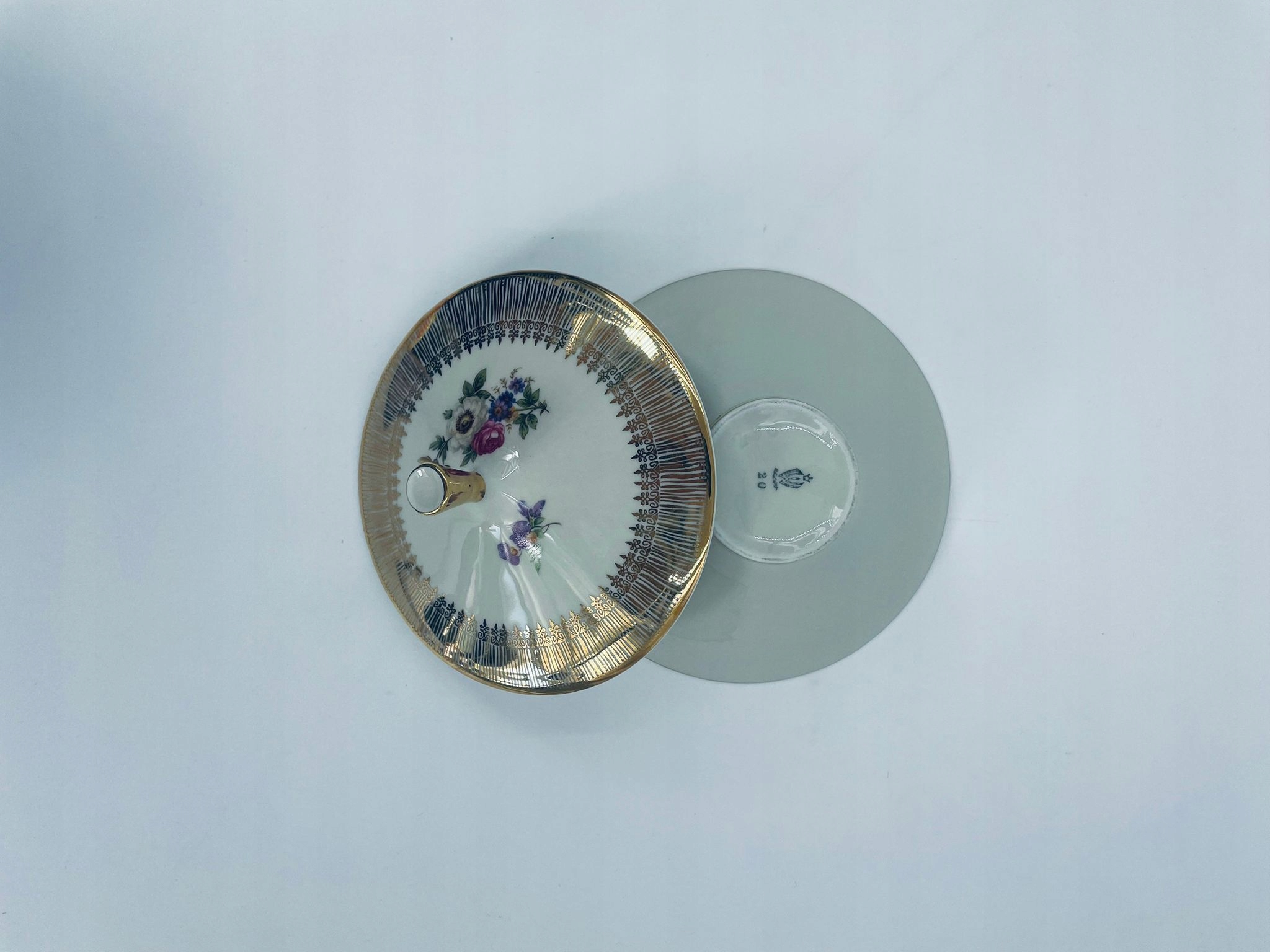 шоколадна коробка Bavaria, виготовлена з високоякісного порцеляни Ecru. Шоколадна коробка з кришкою має класичний та елегантний стиль. Він прикрашений позолотою на краях, покритої широкою золотою візерунком уздовж краю та квітковим мотивом. Він має незначну шкоду покриву кришки, навряд чи видно.