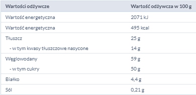 Склад: цукор, глюкозний сироп, какао жир, повне порошкове молоко, порошкове сироватку (з молока), пальмовий жир, какао -м’якоть, етиловий спирт, знежирене порошкове молоко, знежирене, молоко, горіхи фісташки (0,1 %), речовина, що підтримує волого інвертори, емульгатори: лецитін (від сої), E 476, аромати, концентрація спіруліни та яблук, барвник: куркумін