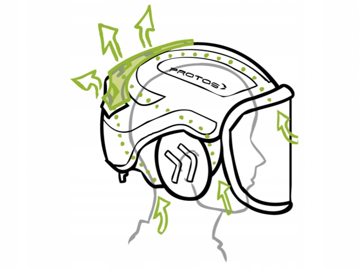 Вбудовані навушники є практичним доповненням, яке можна легко сховати, коли він не використовується. Вони не тільки забезпечують захист від шуму, але й захист від ударів при вдавлюванні в корпус шолома. Шолом Protos сертифікований відповідно до DIN EN 397 і надійно захищає всю голову від впливу падаючих предметів, таких як гілки.