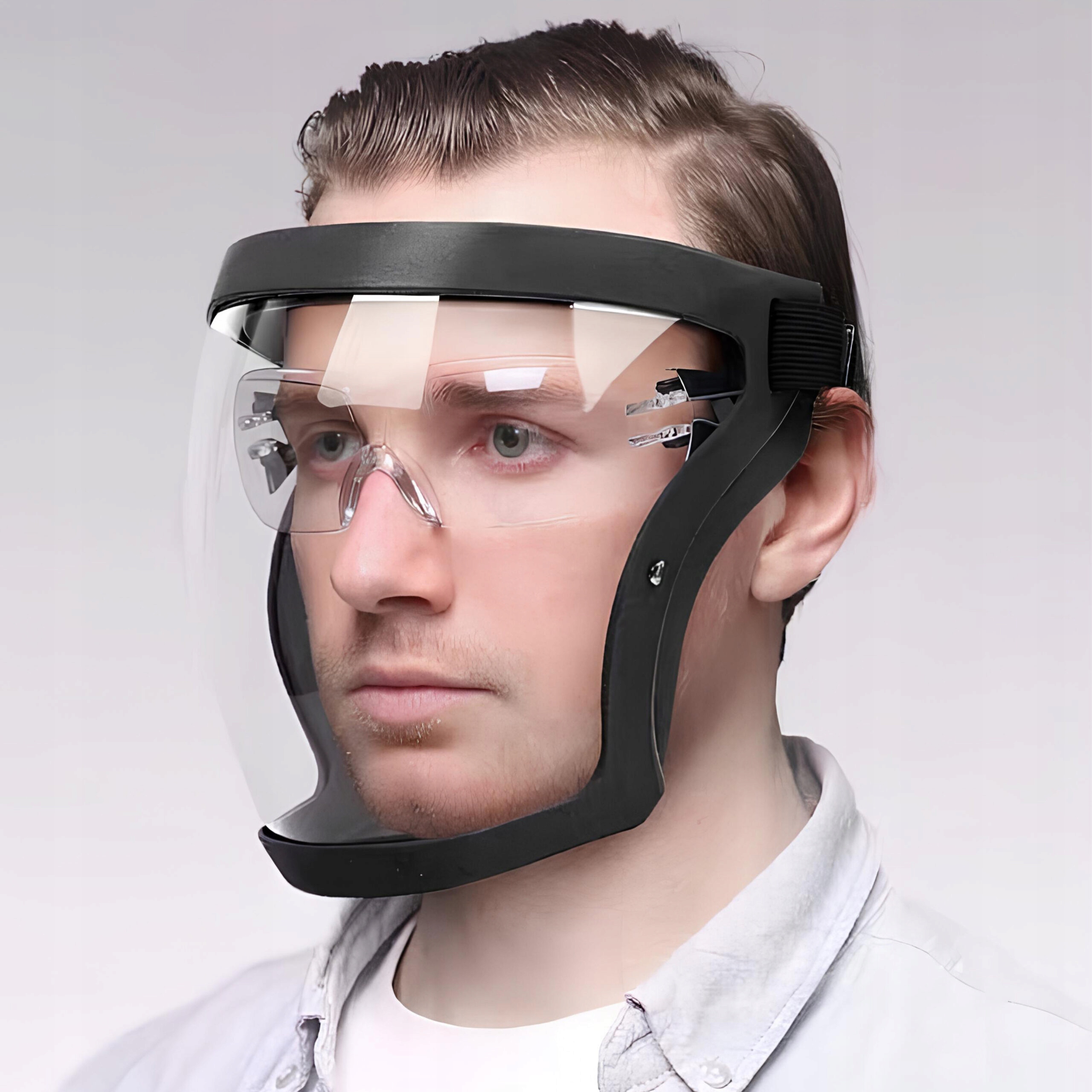 Козирок має прозорий, міцний ПВХ екран, який забезпечує широке поле огляду та забезпечує 100% видимість, захищаючи очі, лоб і ніс і губи.