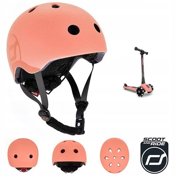 - Колір шолома відповідає колекції Highwaykick 3 LED Icecream - світло-персикова оболонка, на один тон темніша графіка з логотипом Scoot&Ride з боків, ремені для регулювання - темно-сірі