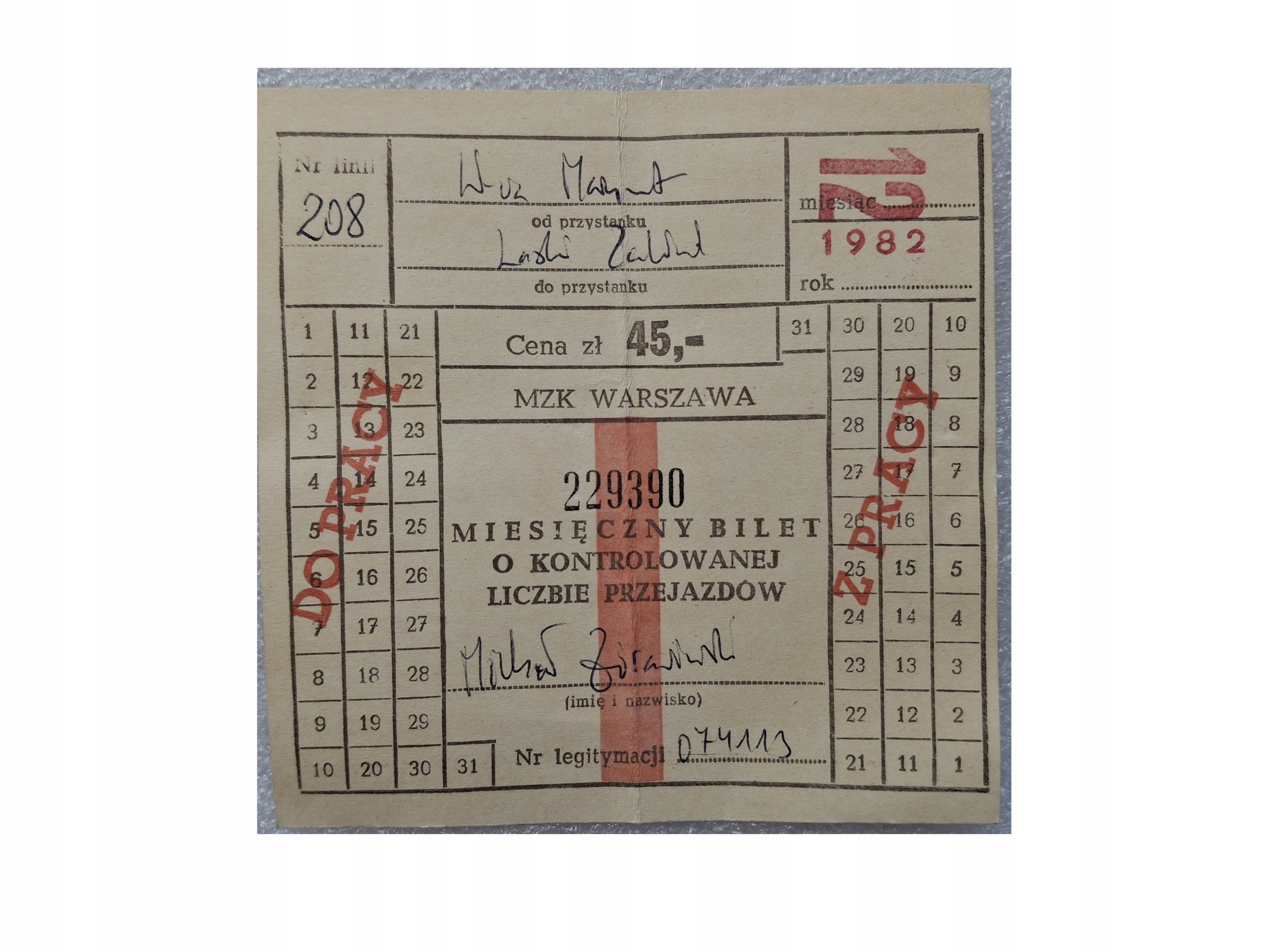 Щомісячний квиток MZK Warsaw 1982