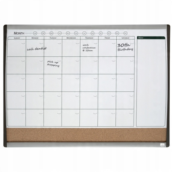 Багатофункціональний магнітний щомісячний планувальник Nobo з двома поверхнями: магнітною поверхнею для сухого стирання з календарною сіткою та пробковою секцією внизу для прикріплення нотаток.