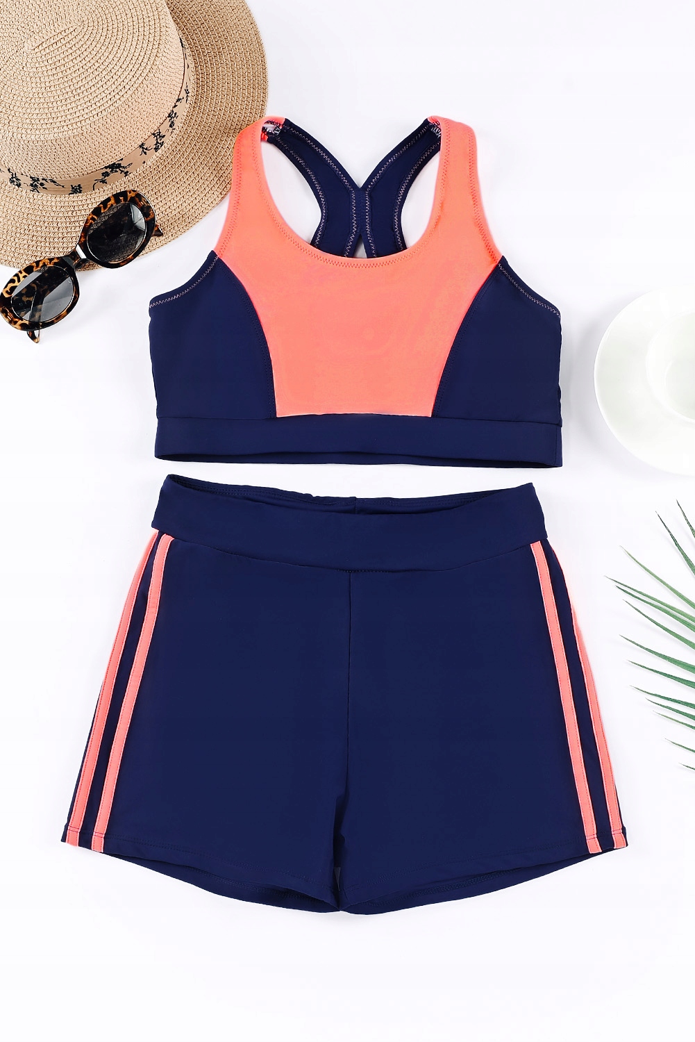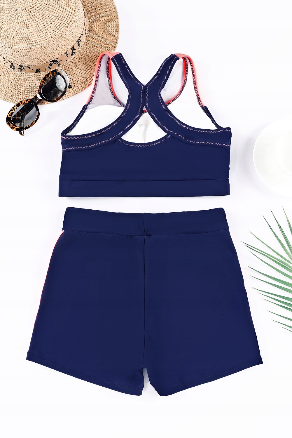 Верх - знімні губки в чашках, оброблені широкою гумкою. Завищена талія - шорти з лампасами. Задня частина топа виглядає як боксер.