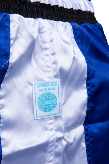Нашивка з логотипом WAKO на правій нозі - сертифікована для участі в змаганнях з кікбоксингу.