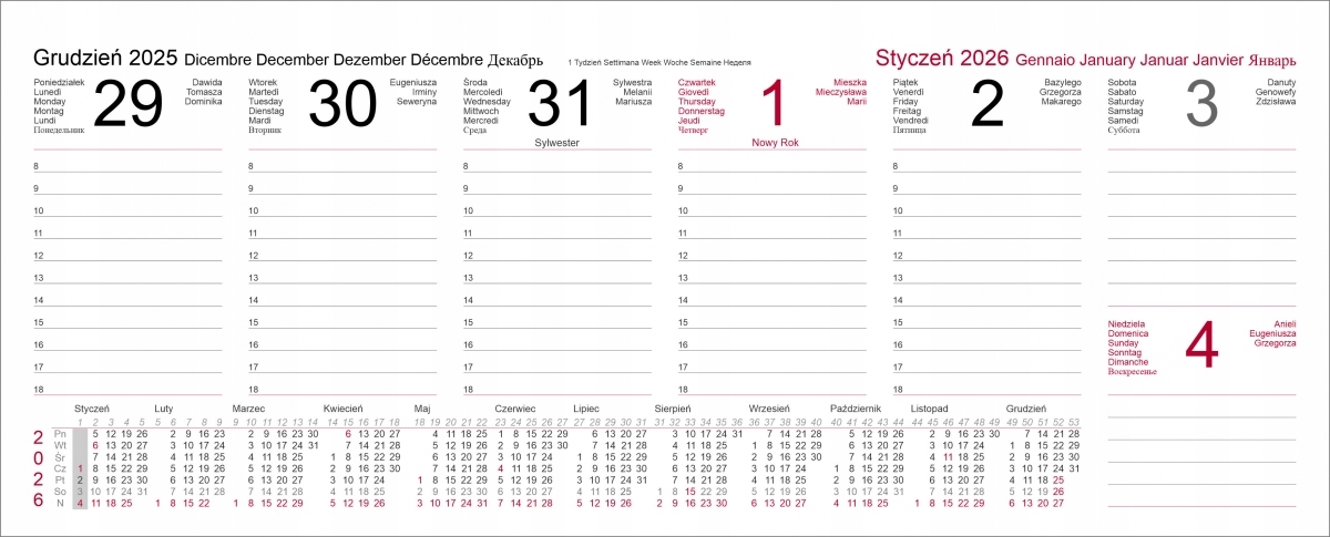 Універсальний персонаж здобувається шляхом перекладу всіх імен місяців та днів тижня на 5 додаткових мов. Окрім польської мови в календарі преміум -класу, ми знаходимо італійську, англійську, німецьку, французьку та російську. Кожна копія календаря захищена в пластиковій упаковці.