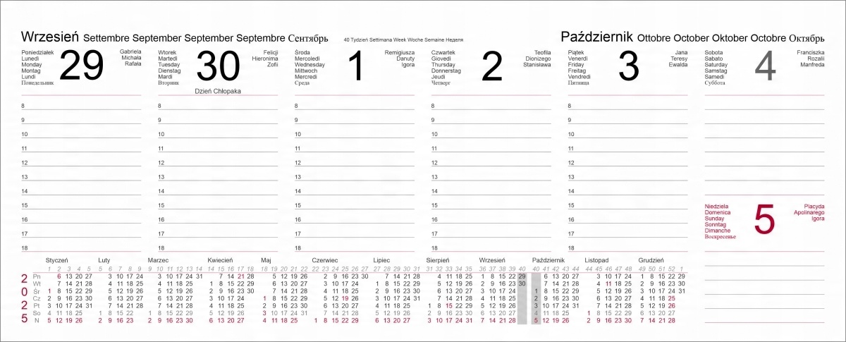 Престижний календар столу, що стоїть на основі, обрамленому в ексклюзивному шпоні. Зручна та надзвичайно корисна для навчання та роботи - це дозволяє ефективно планувати час і полегшує запам'ятовування про важливі дати та завдання. На кожній сторінці календаря ми знаходимо скорочений календар цілого року з 1 січня 2025 по 31 грудня 2025 року зі спеціально розрізненим тижнем - це дозволяє швидко орієнтуватися та перевірити майбутні умови. 2025.