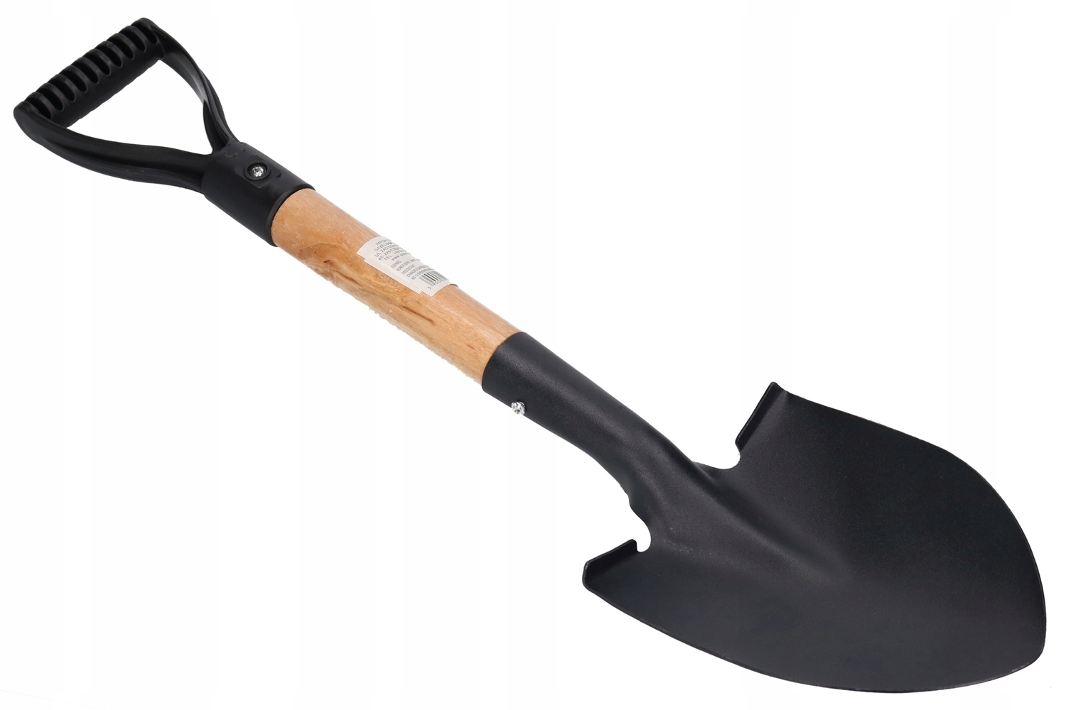 Металева лопата, з дерев'яною ручкою та пластиковою ручкою.