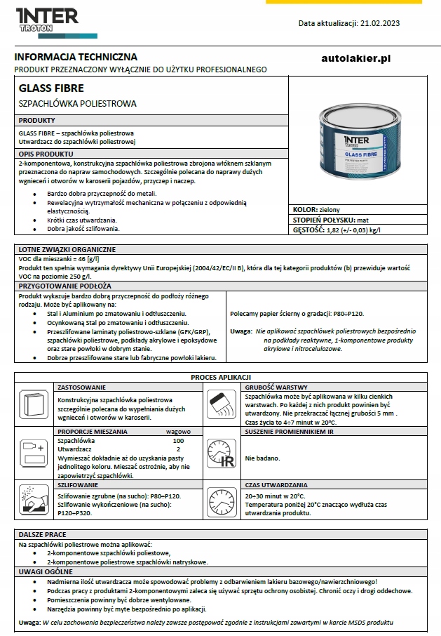 2-компонентна поліефірна шпаклівка, армована скловолокном, призначена для ремонту автомобілів.