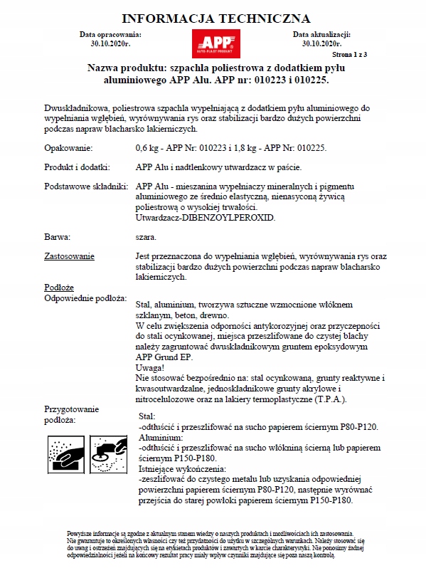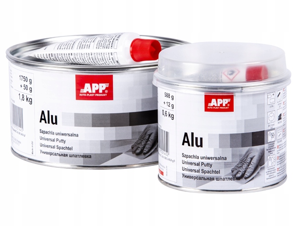 APP Alu – двокомпонентна поліефірна шпаклівка з додаванням алюмінієвого пилу. Призначений для заповнення порожнин, вирівнювання подряпин і стабілізації великих поверхонь, на яких дуже добре розподіляється. Має підвищену механічну стійкість.