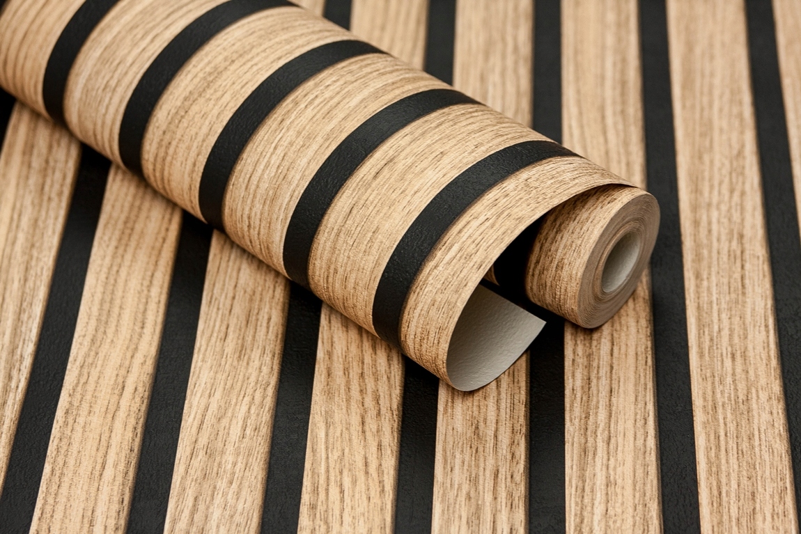 - шпалери з вертикальними тонкими дубовими планками - ламелями. Сучасний, модний малюнок з 3D ефектом ідеально відтворює дерев'яні елементи. Ширина темних смуг 1,5 см, світлих смуг 4 см.