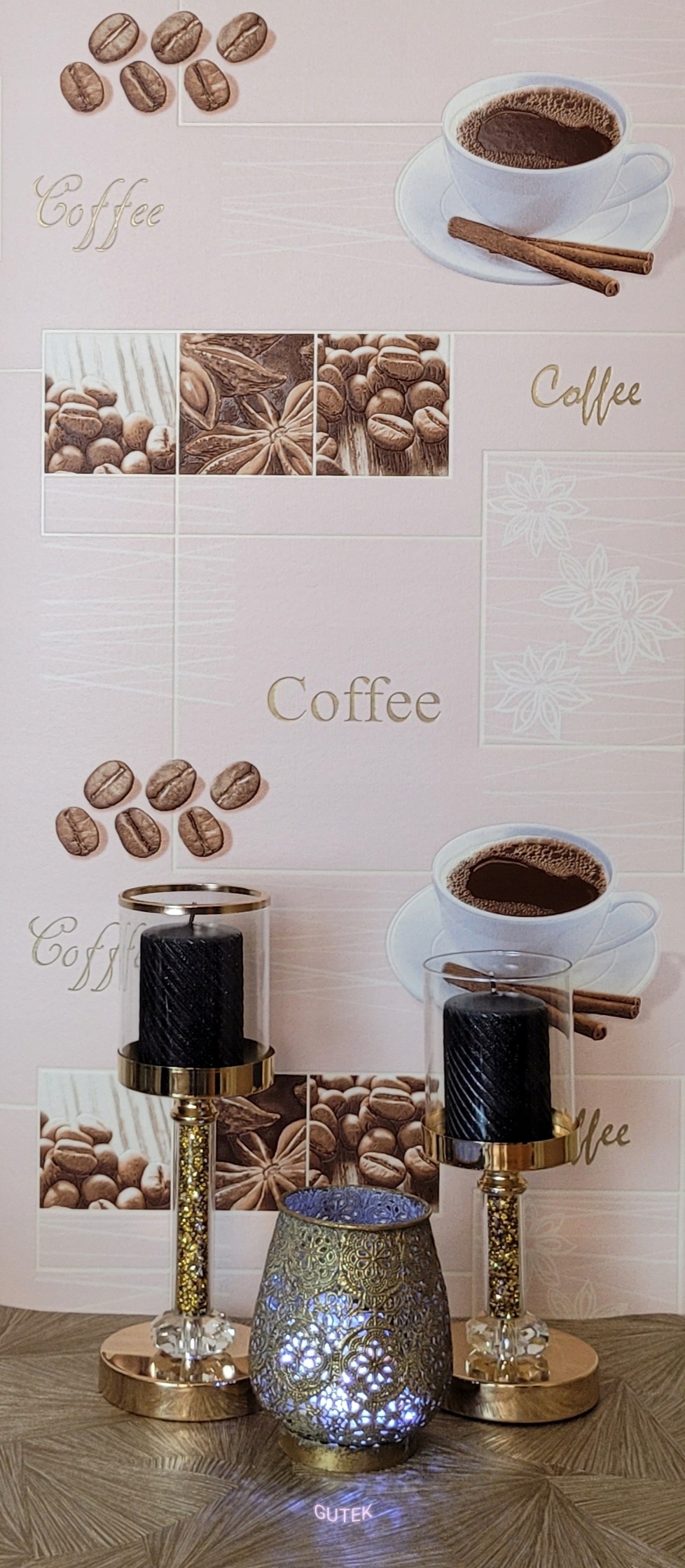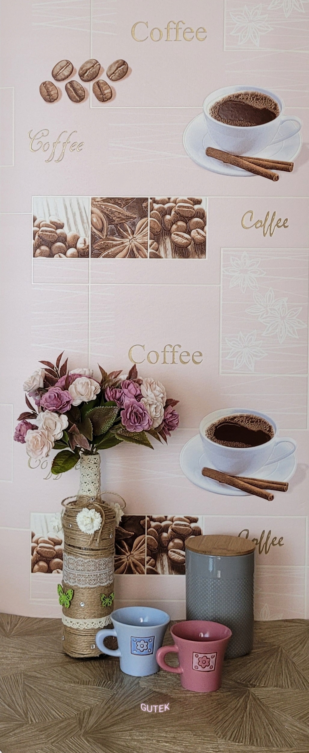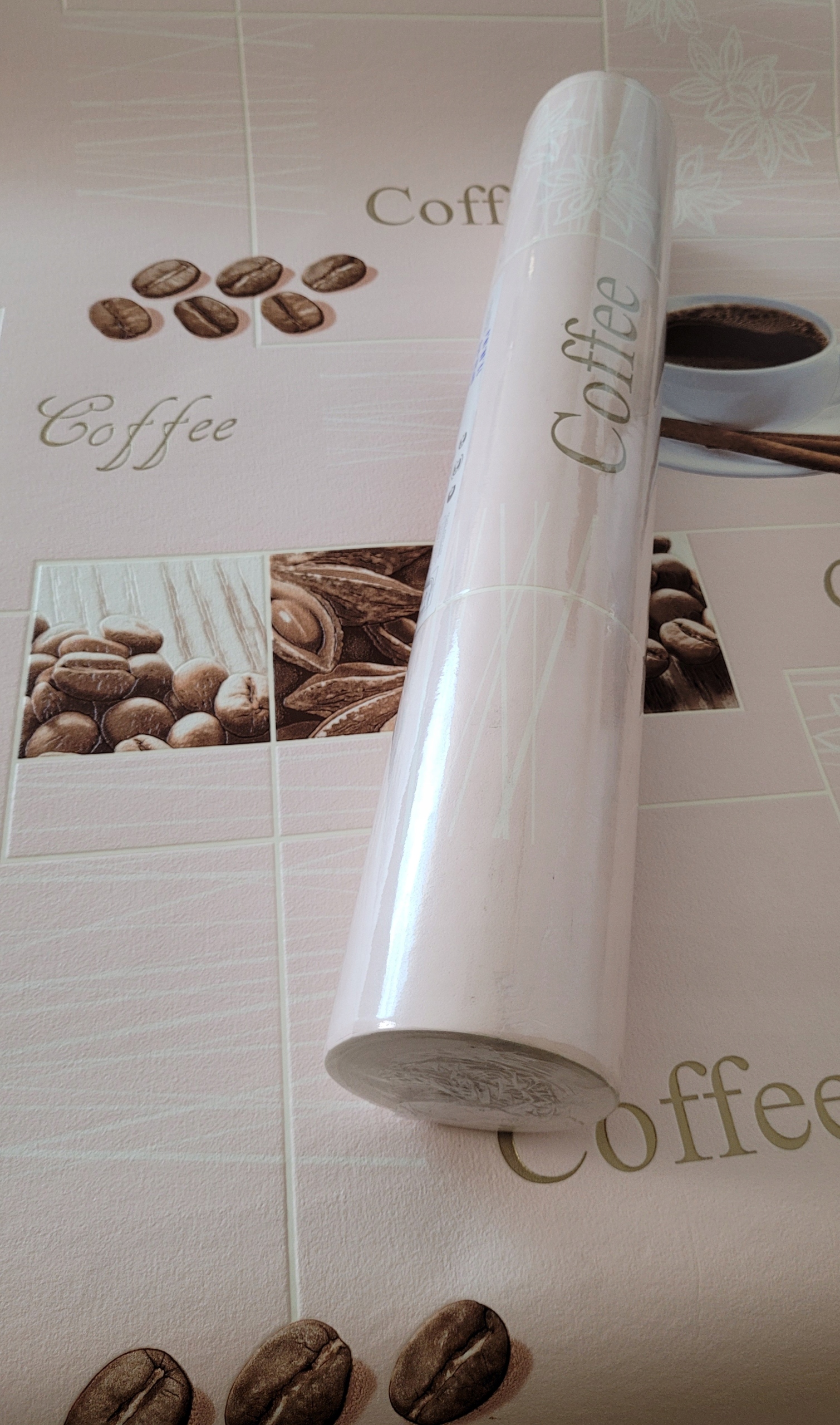 Шпалери в рожевих, кремових, білих і коричневих відтінках, прикрашені кухонним візерунком із зображенням плитки, кави і чашки - цікава концепція, яка зробить інтер'єр унікальним.