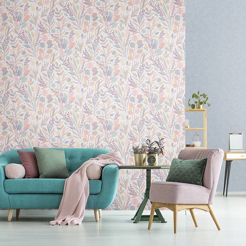 - Шпалери представлені у відтінках жовтого, синього, фіолетового та рожевого кольорів