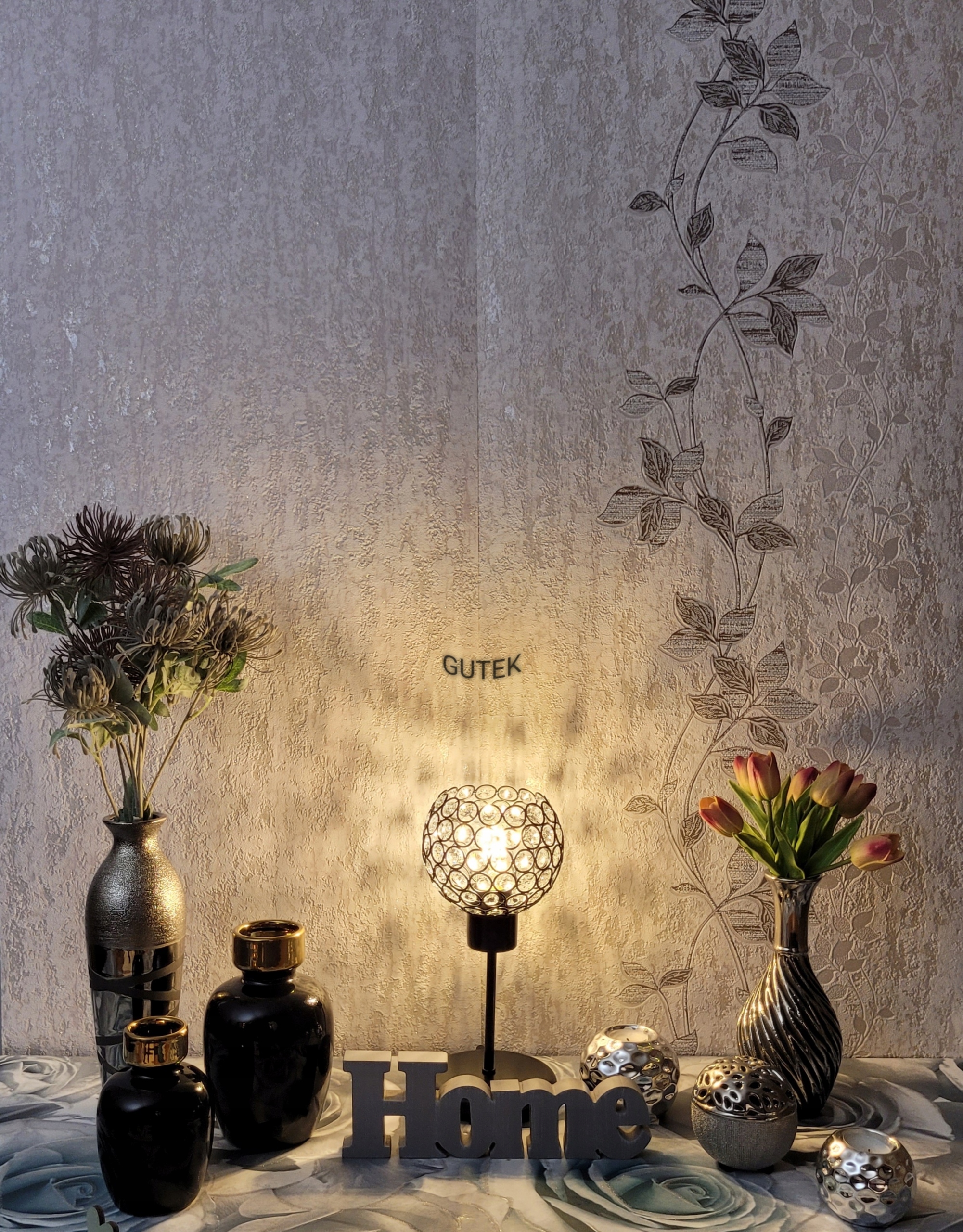 - Шпалери ніжного тиснення, матові, з блискучими срібними та золотими елементами. Красиво виглядає на стіні