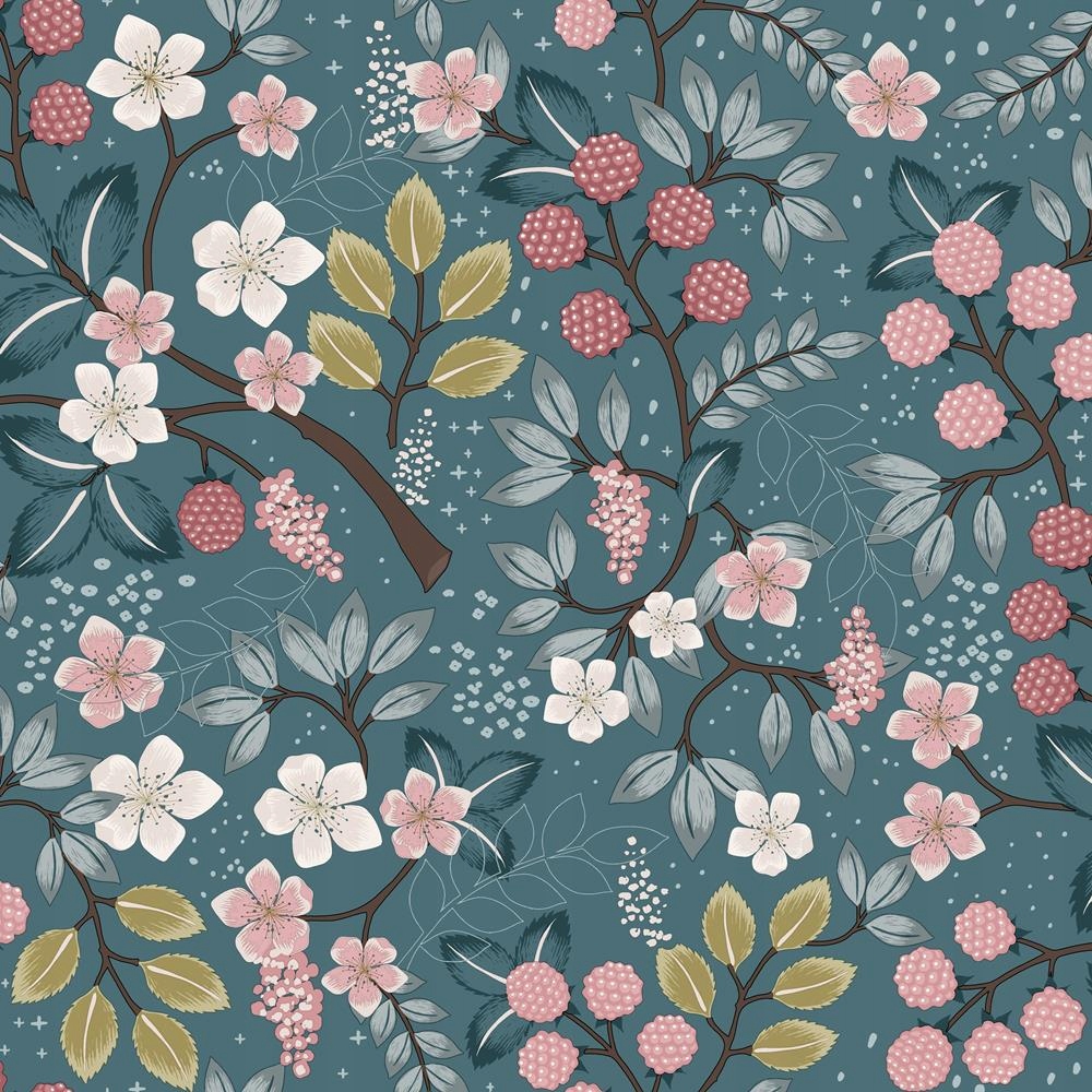 - Шпалери мають відтінки темно-синього, зеленого, рожевого та блакитного кольорів