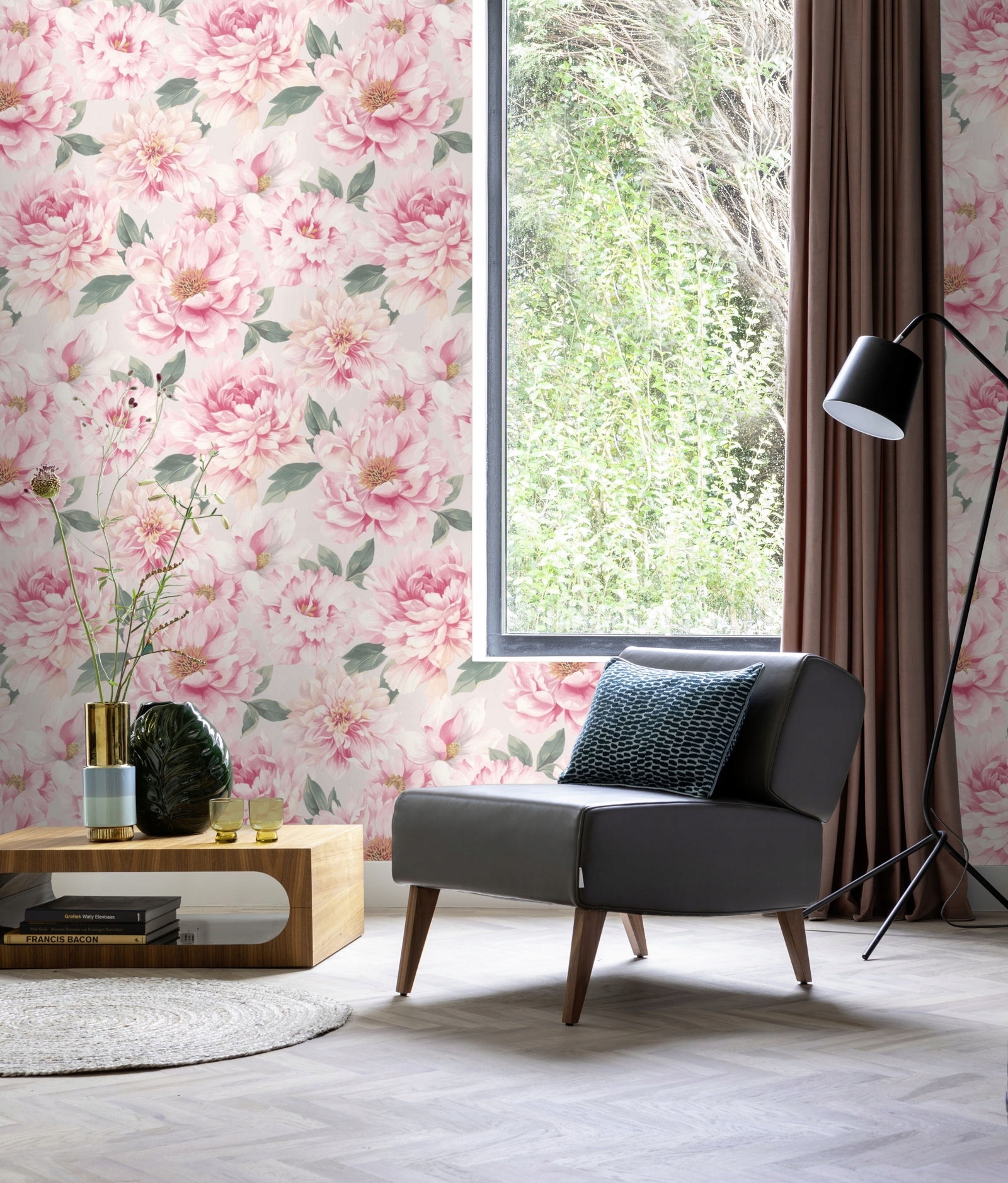 ШПАЛЕРИ РОСЛИНИ ВІЗЕРУНОК ВЕЛИКІ КВІТИ ПІОНІЇ ТРОЯНДИ ЛИСТЯ