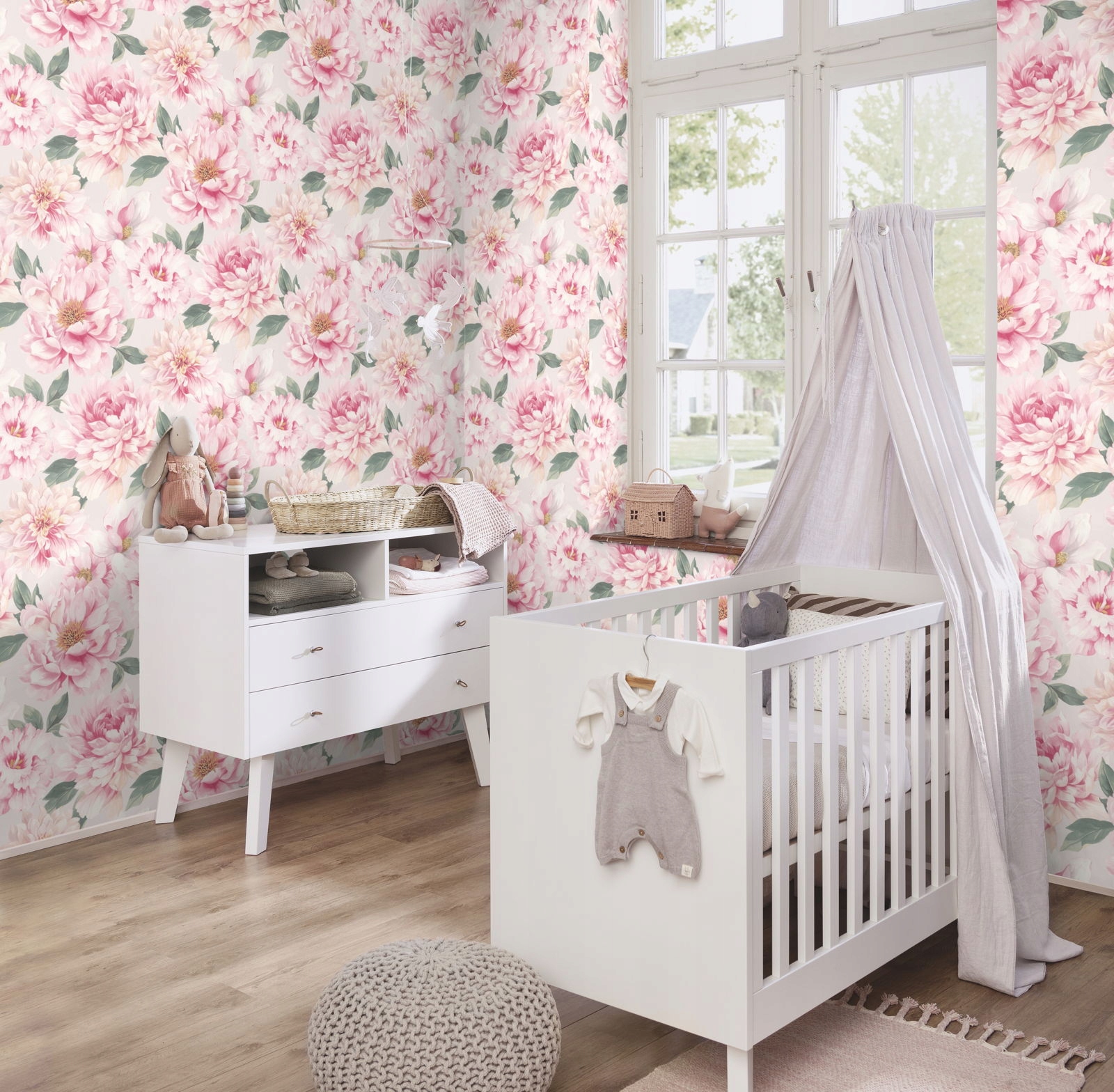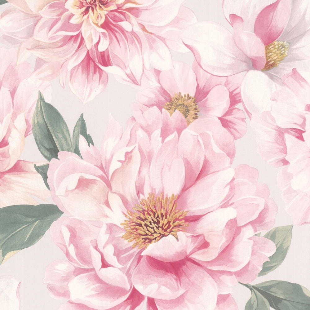 - Тло шпалер має світло-сірий відтінок, а квіти — рожеві з зеленим листям.