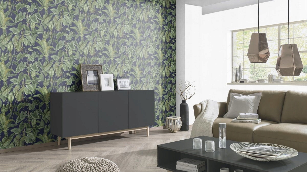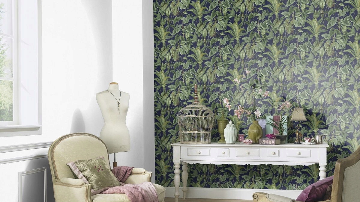 Поверхня шпалер гладка, матова. Шпалери мають відтінки зеленого та синього.