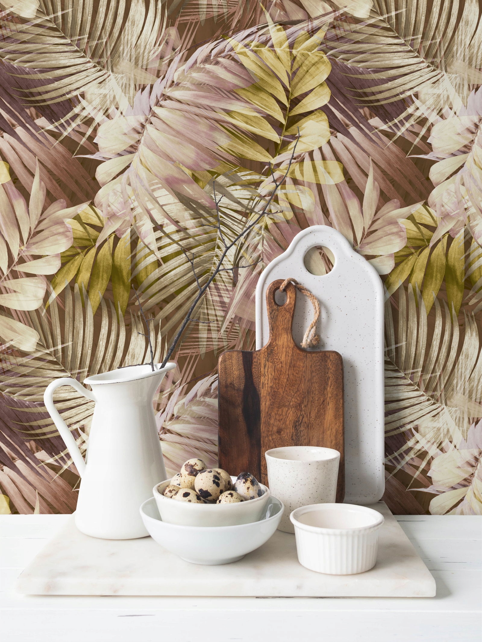 - Шпалери мають відтінки бежевого, рожевого, зеленого та коричневого < /ul>