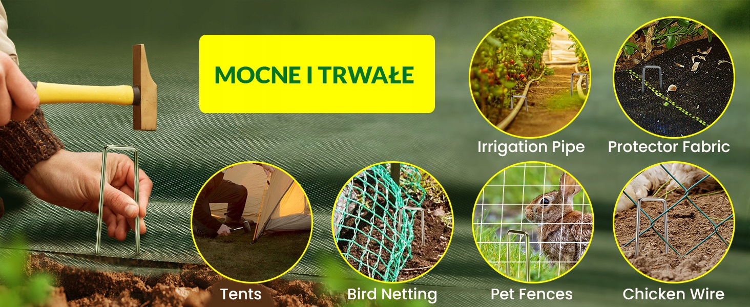 Завдяки гальванізації дюбелі стійкі до погодних умов, що гарантує тривалий захист від корозії. Форма "U" полегшує стабільну кріплення різних елементів у саду, таких як агротекстиль для бур’янів, сітків, огорож та структурних елементів. Широке застосування штифта робить його незамінним елементом при встановленні огорож, дерев’яних конструкцій або під час садівництва.