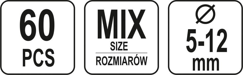 - Контери вмісту набору з головка та отвір x60 (5x25 мм x4, 6x25 мм x4, 6x30 мм x3, 6x40 мм x4, 6x45 мм x3, 6x50 мм x3, 6x60 мм x3, 6x65 мм x3, 8x25 мм x3, 8x30 мм x3, 8x40 мм x4, 8x45 мм x3, 8x50 мм x2, 8x6