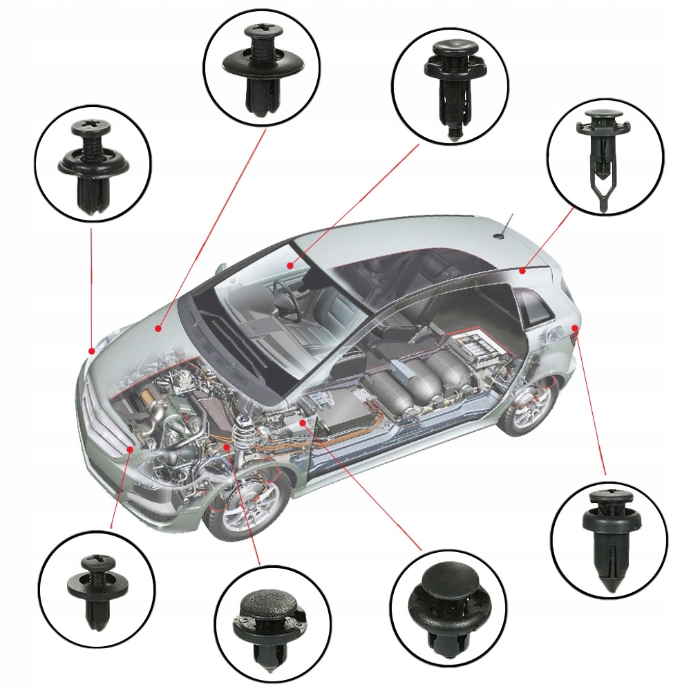 Набір із 805 шпильок для оббивки 16 найпопулярніших розмірів. Універсальні кліпси підходять до таких моделей як: BMW, Audi, Mercedes, Kia, Ford, Mazda, Kia та багато інших. Кліпси виготовлені з пластику, що робить їх стійкими до атмосферних впливів. У набір входить набір аксесуарів, необхідних для збирання або розбирання кліпс :)