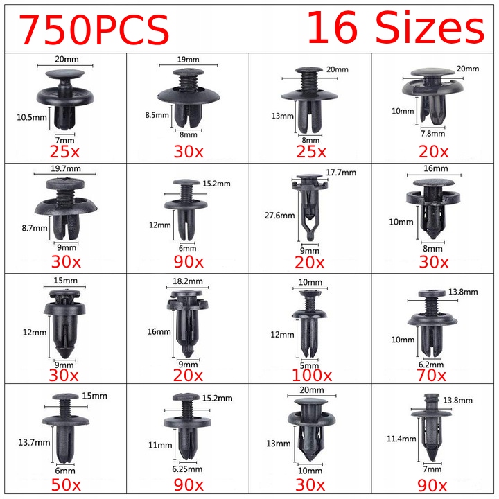 Набір із 805 шпильок для оббивки 16 найпопулярніших розмірів. Універсальні кліпси підходять до таких моделей як: BMW, Audi, Mercedes, Kia, Ford, Mazda, Kia та багато інших. Кліпси виготовлені з пластику, що робить їх стійкими до атмосферних впливів. У набір входить набір аксесуарів, необхідних для збирання або розбирання кліпс :)
