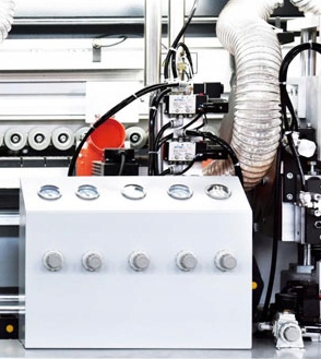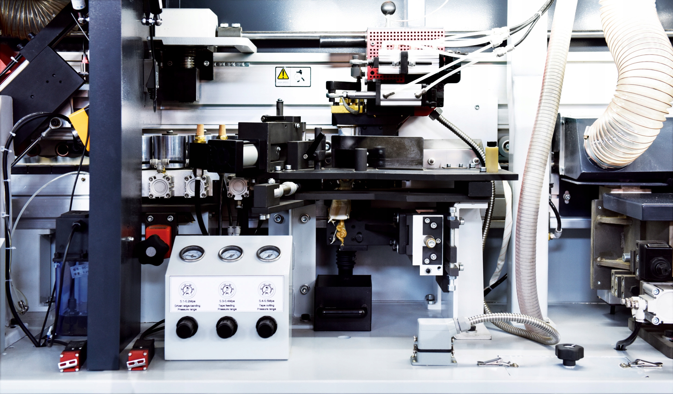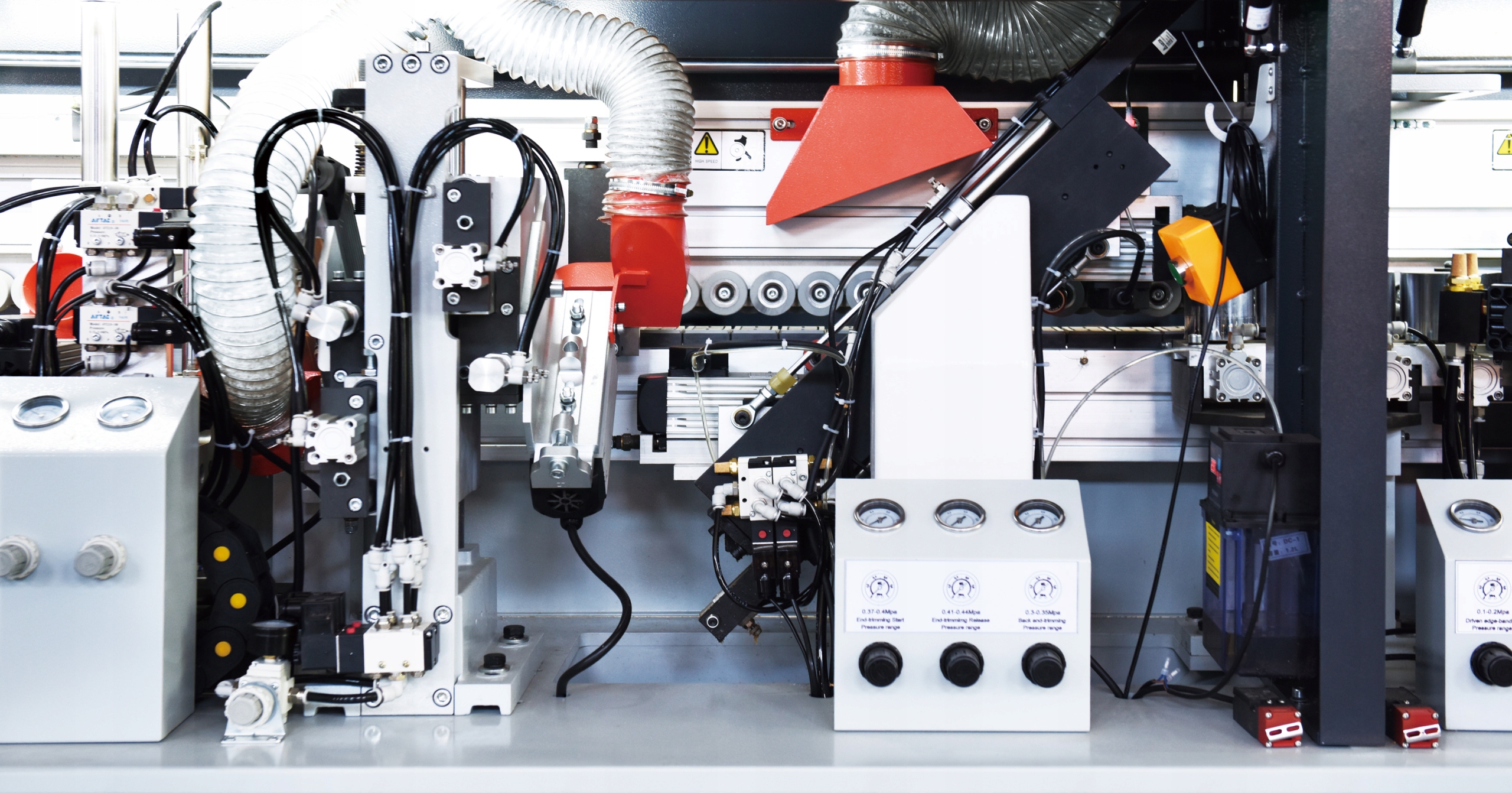 - Два двигуни потужністю 0,37 кВт, частота 200 Гц, швидкість: 12000 об/хв. Оснащений ручним механізмом обертання двигуна для регулювання кута різання надлишку шпону спереду та ззаду.