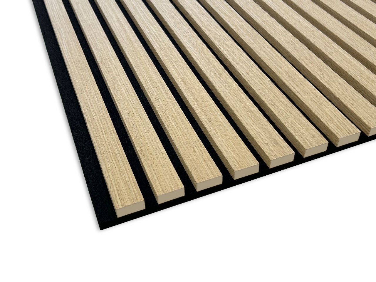 Наші шпоновані ламелі Світлий дуб — це квінтесенція елегантності та довговічності, ідеальні для людей, які цінують природну красу та найвищу якість. Кожна планка облицьована з трьох сторін дубом, що забезпечує унікальну та теплу естетику будь-якого інтер’єру. Що вирізняє наш продукт на ринку, так це надзвичайно товстий і міцний повсть глибокого чорного кольору, на якому кріпляться ламелі, що забезпечує додаткову акустичну ізоляцію та винятковий комфорт використання.