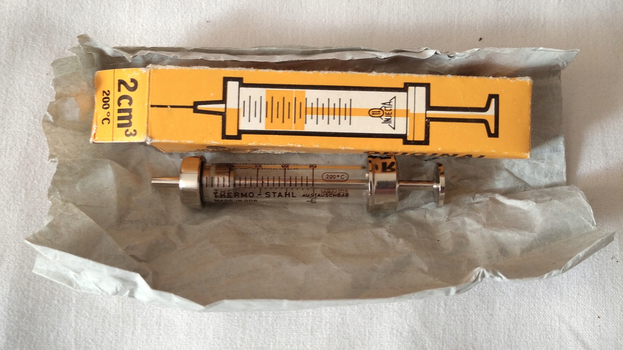 оригінальний німецький тепло -стійкий шприц (200 градусів С), сталь з часів польської народної республіки. Він спочатку упакований. Упаковка трохи зігнута.