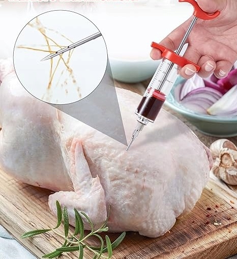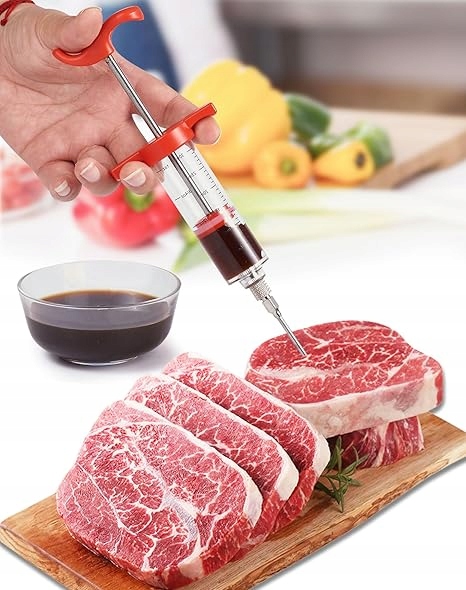 - Шприц для м'яса оснащений силіконовим ущільнювачем без BPA, він не протікає. Набір харчових шприців для спецій для маринування/випічки гарантує безпеку вам і вашій родині. клас харчовий контакт PS і нержавіюча сталь, безпечний, м'який і надзвичайно стійкий до високих температур, не ламається і не змінює смак і запах їжі. Підходить для багаторазового використання.