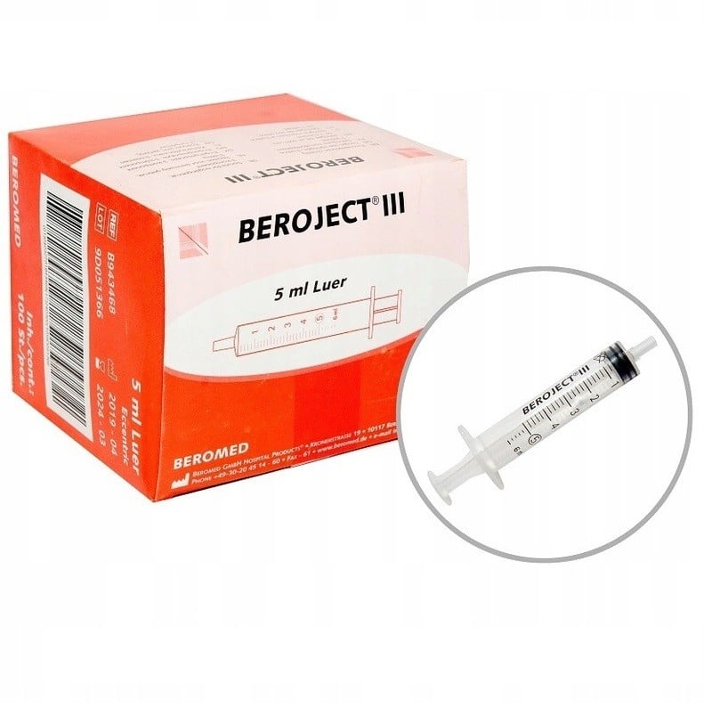 Трьохкомпонентний одноразовий шприц Bero-Ject без голки з наконечником Люера. Він має чорну мірну чашку.