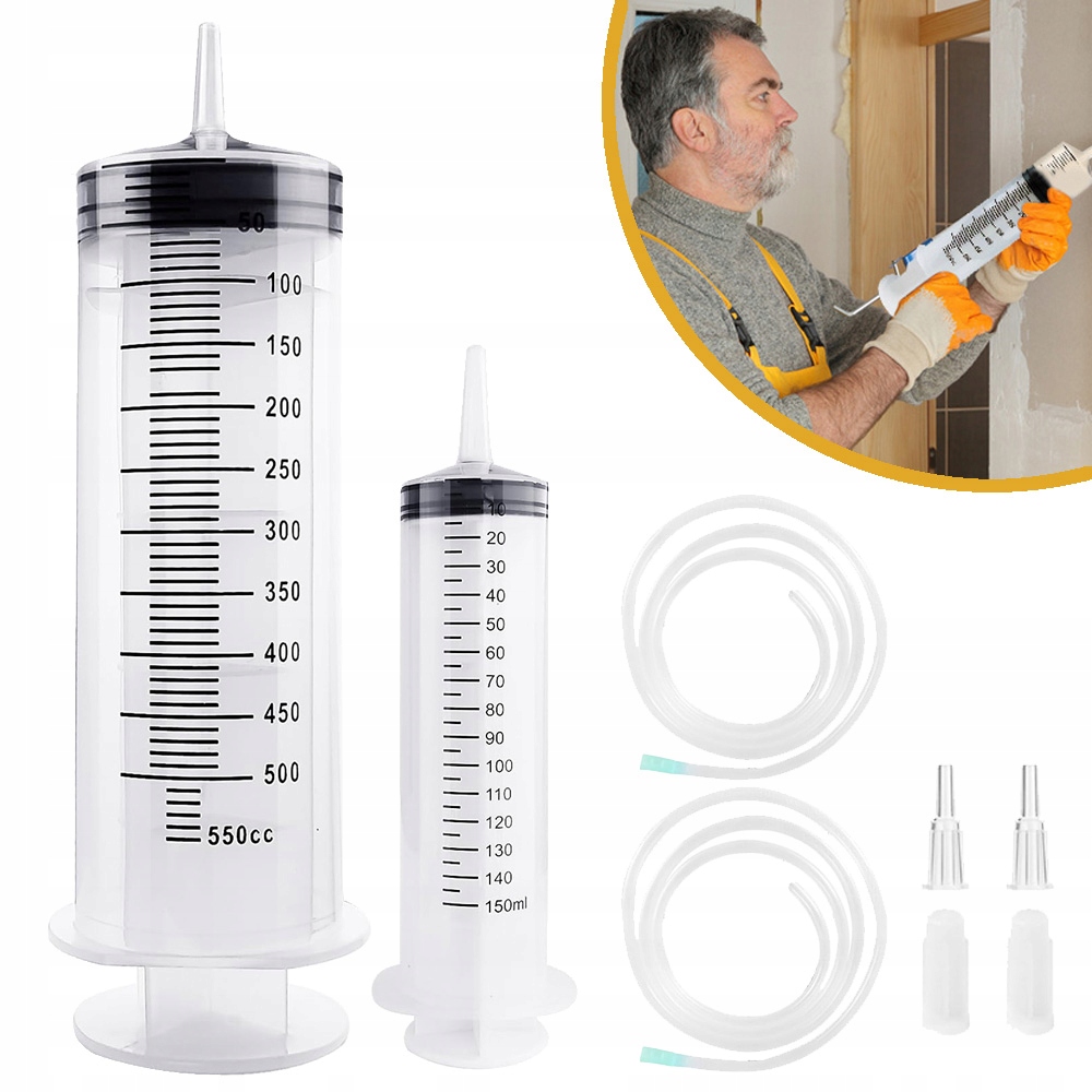 Ви отримаєте 2 шприци, 150 мл та 550 мл, 2 шланги діаметром прибл. 5 мм і довжиною 1 м, усе в індивідуально запечатаних упаковках для забезпечення безпеки та гігієни продукту.