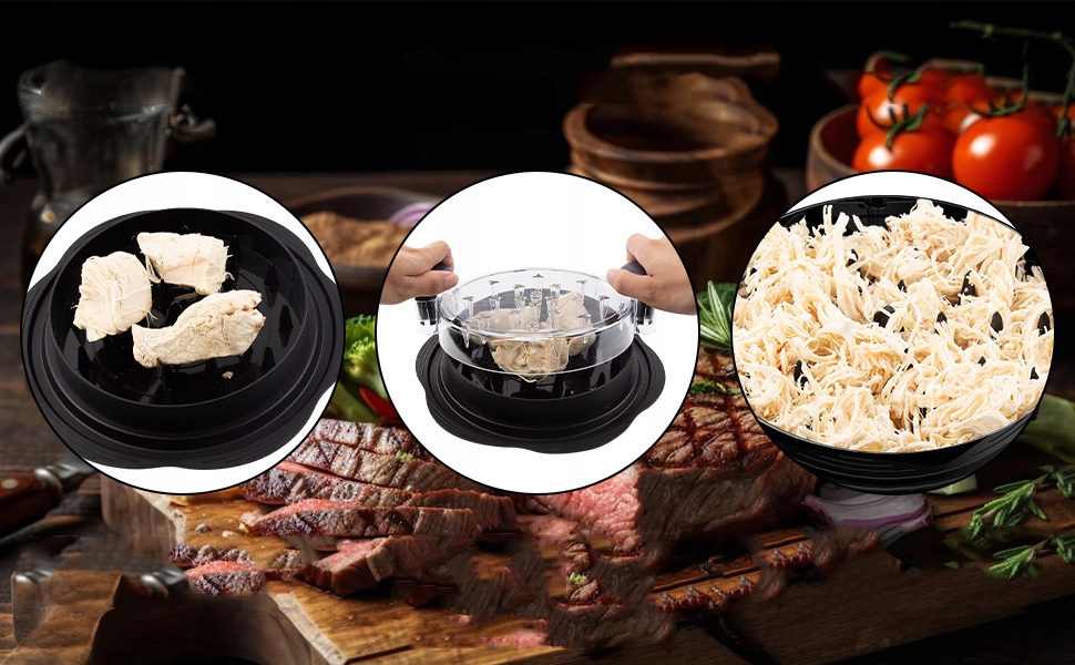 - 🥚Простий у використанні, просто помістіть м’ясо в контейнер для нарізки, закрийте кришку, візьміть ручку обома руками та поверніть її кілька разів.