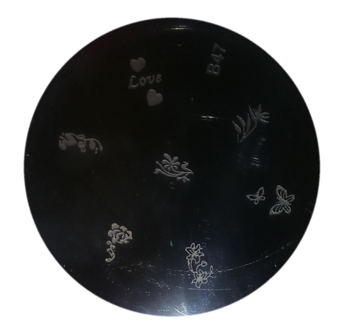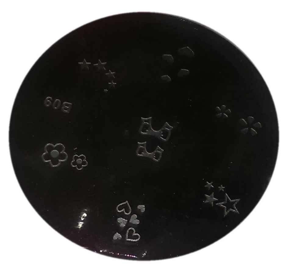 Спосіб застосування: зніміть захисну плівку з пластини з візерунком, намалюйте вибраний малюнок на пластині лаком або фарбою та зішкребіть надлишки лаку. Потім відштампуйте візерунок гумовим штампом і прикладіть його до нігтя або кінчика.