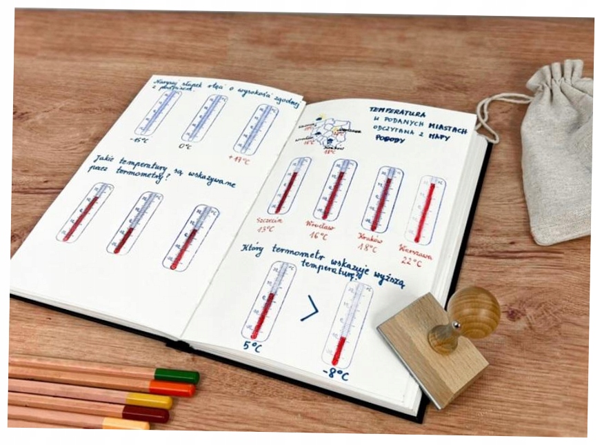 Навчальний штамп може використовуватися різними способами. Це буде ідеально для гри в домашніх умовах та навчання під час роботи в групі під час уроку природи або використання використання штампу. Below are some of them: the child colors a mercury bolted by a stamp according to the saved positive or negative temperatures, the teacher or parent selects the temperature on the mercury post and the child's task is to read this value and save it, the child compares the temperature from two thermometers and calculates their difference, using a stamp map of Poland and a stamp, the child is designed to read previously posted by a teacher or a temperature parent Weather maps, a child with a stamp can keep a weather diary in його місто та зберегти штамп: 55 мм х 20 мм