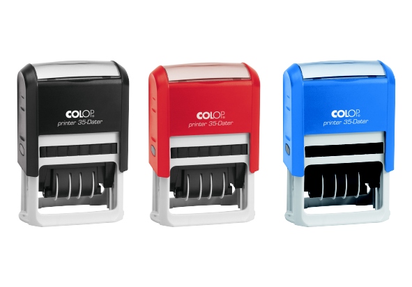Темою є прямокутна марка з текстовою табличкою Штамп із датою Colop 35