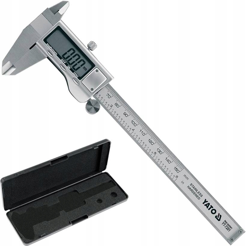 - Електронний штангенциркуль YATO виготовлений з нержавіючої сталі, має точність 0,02 мм і діапазон вимірювання 0-150 мм.